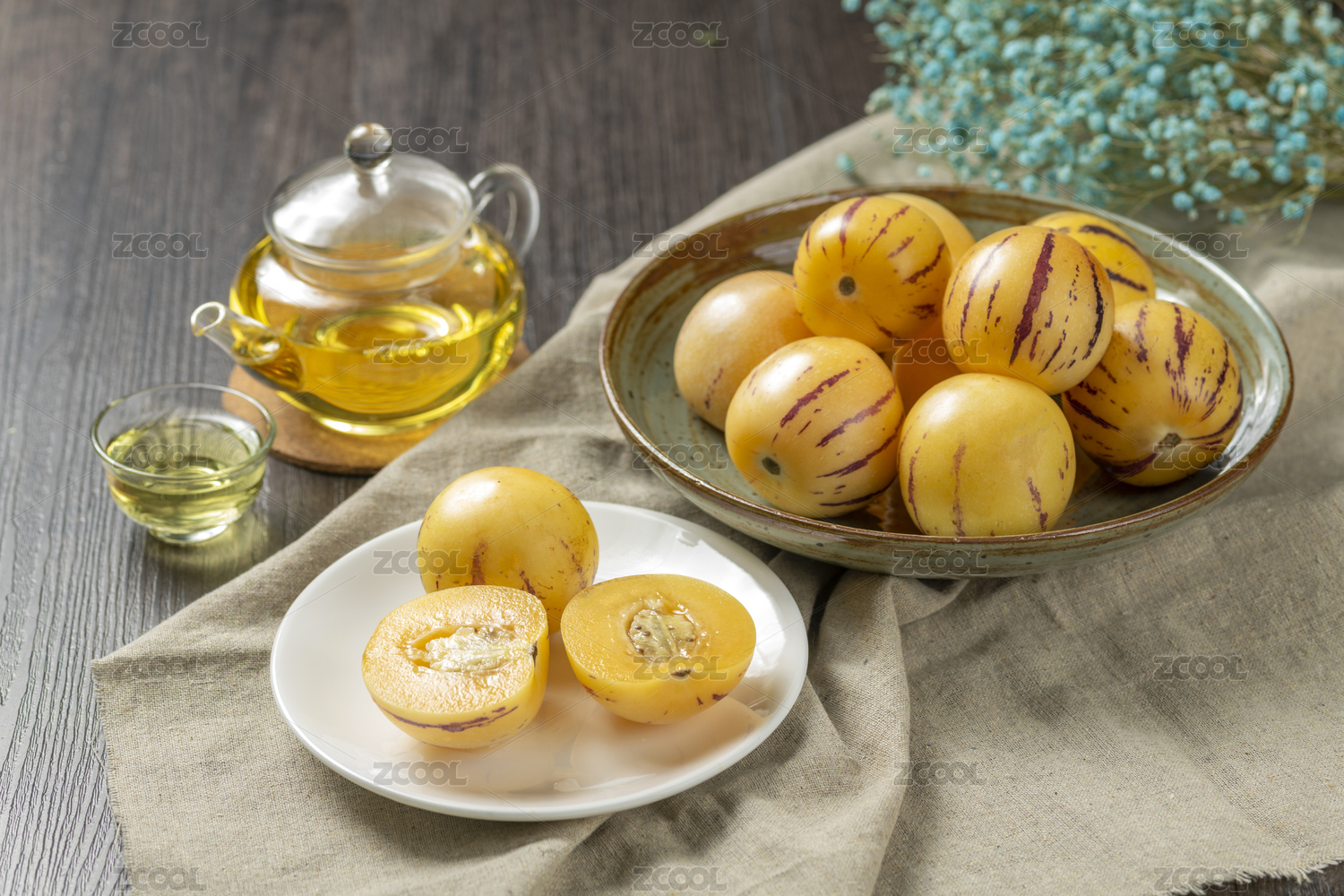 人参果,香瓜茄,长寿果,切开,切开人参果,人参果切半,金色叉子,一盘,茶水,茶壶