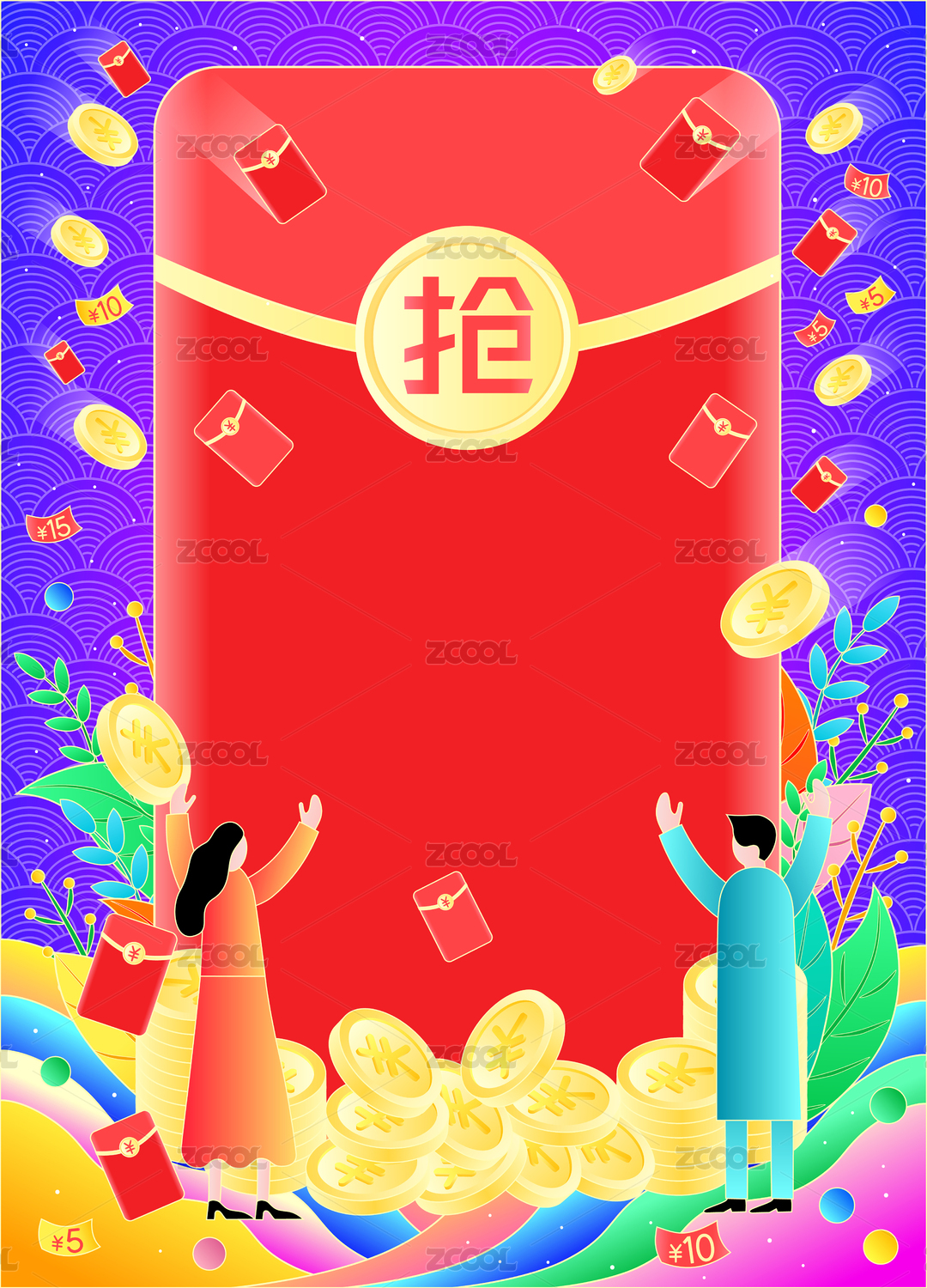 炫彩国潮抢红包优惠券红包雨金币矢量插画