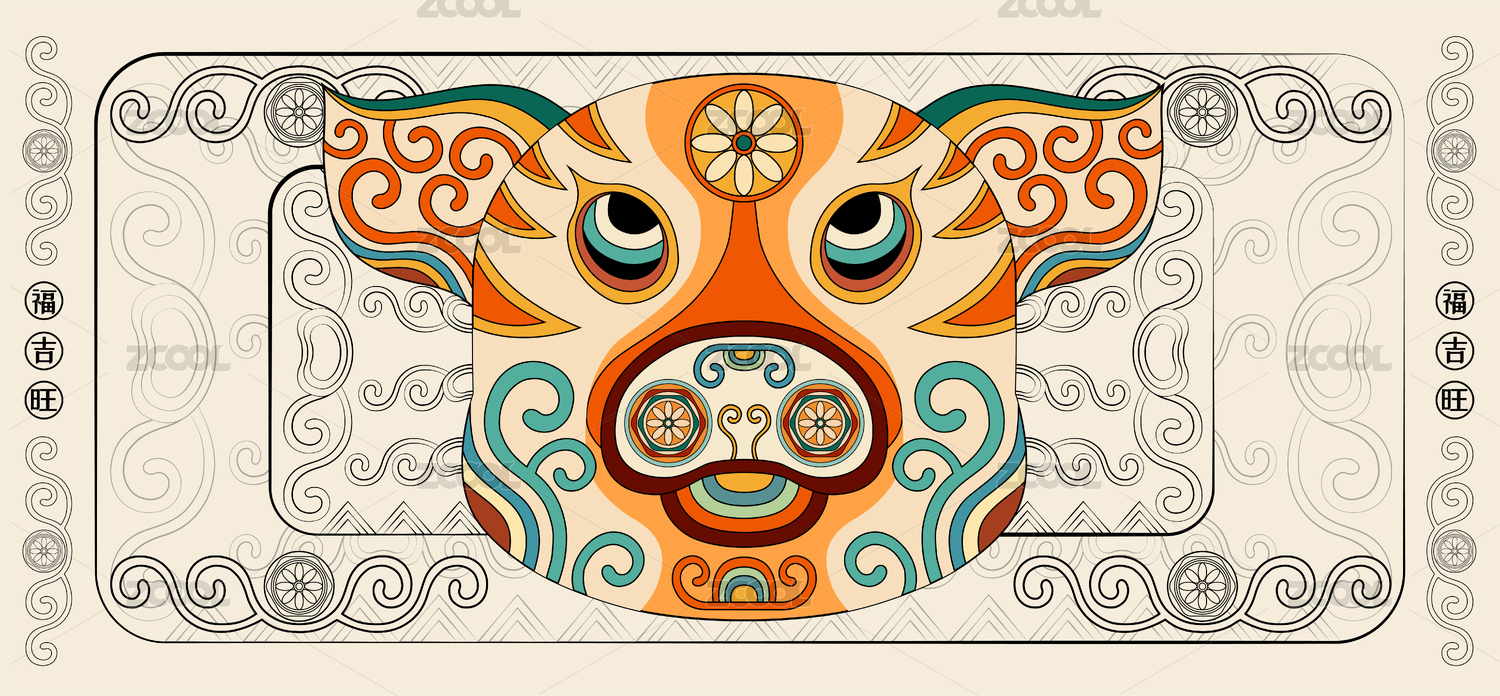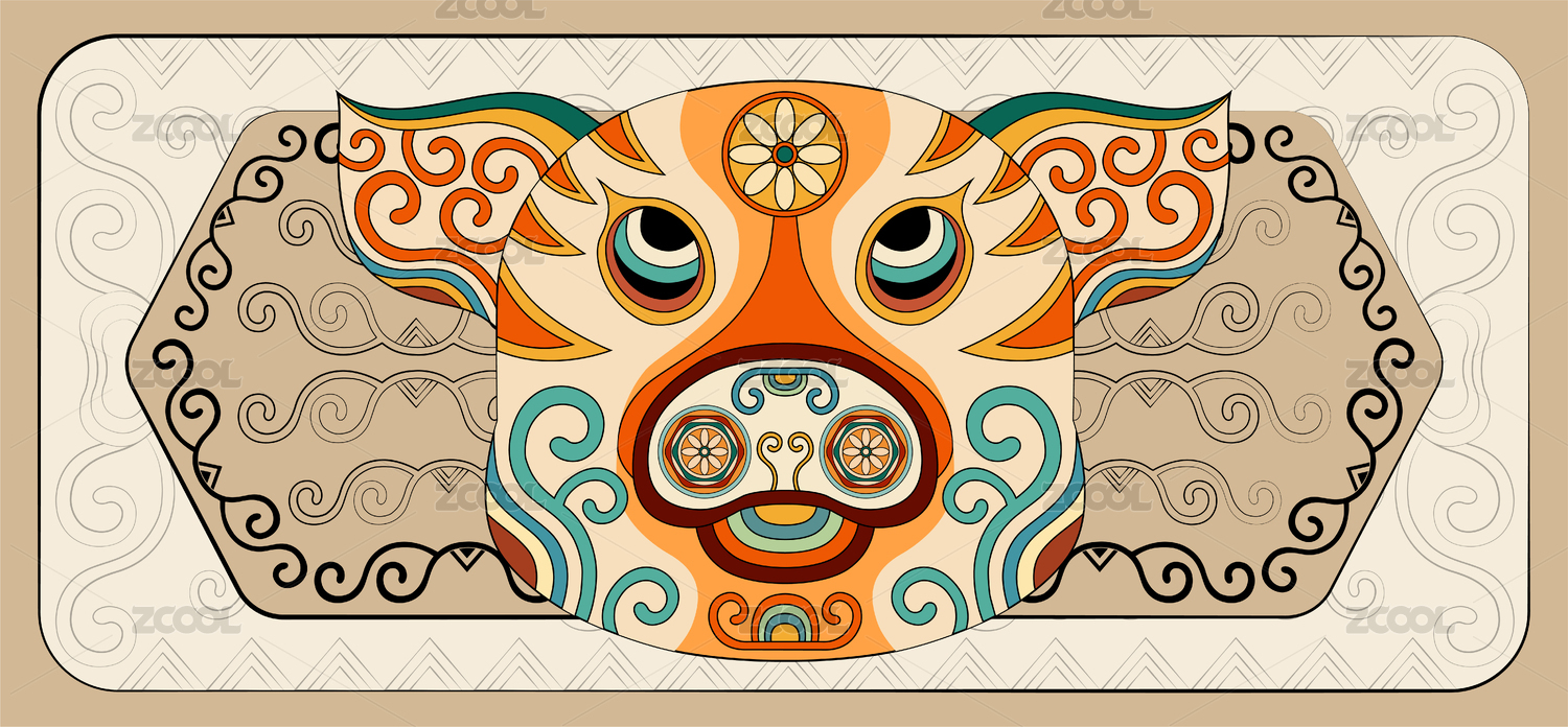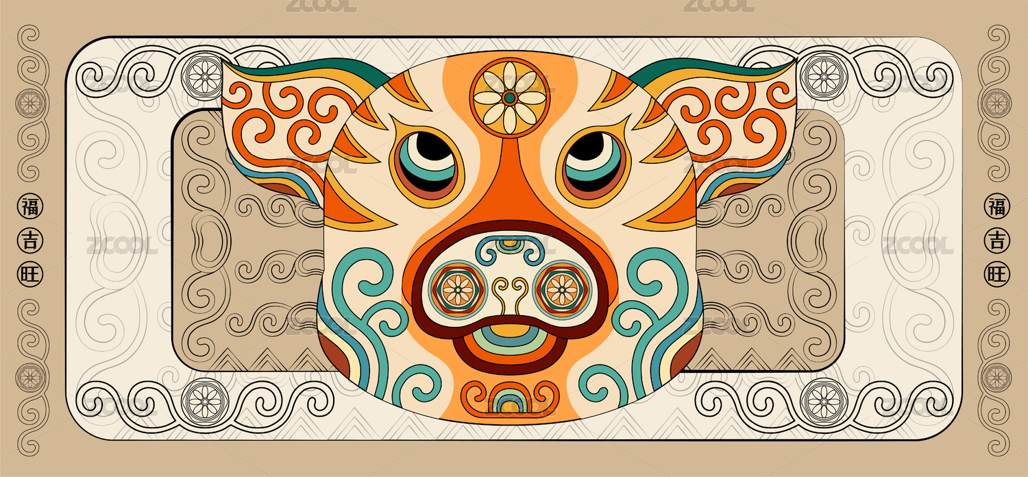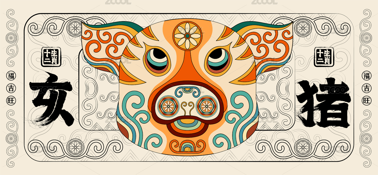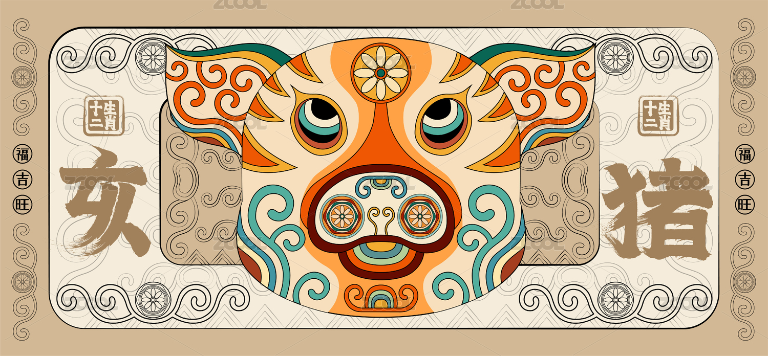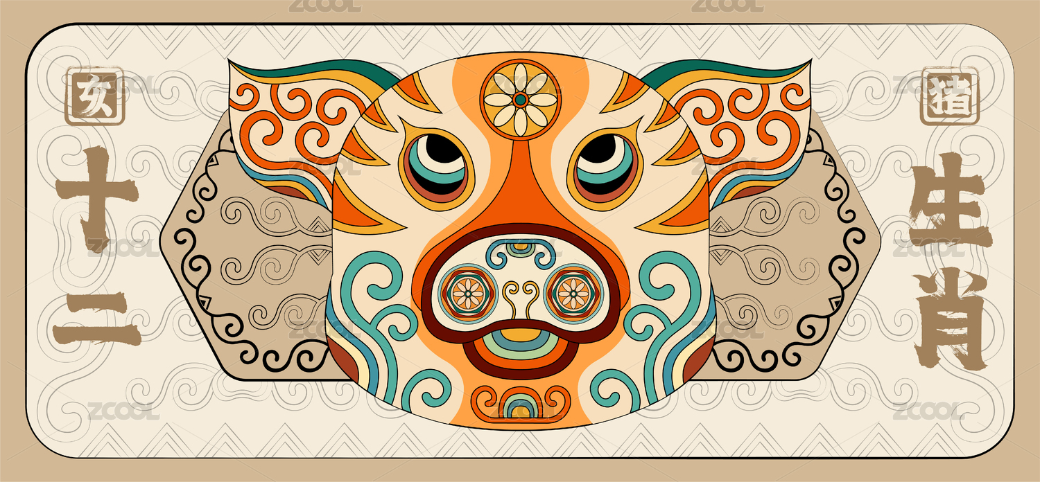 亥猪十二生肖国潮传统艺术装饰纹样卡通形象