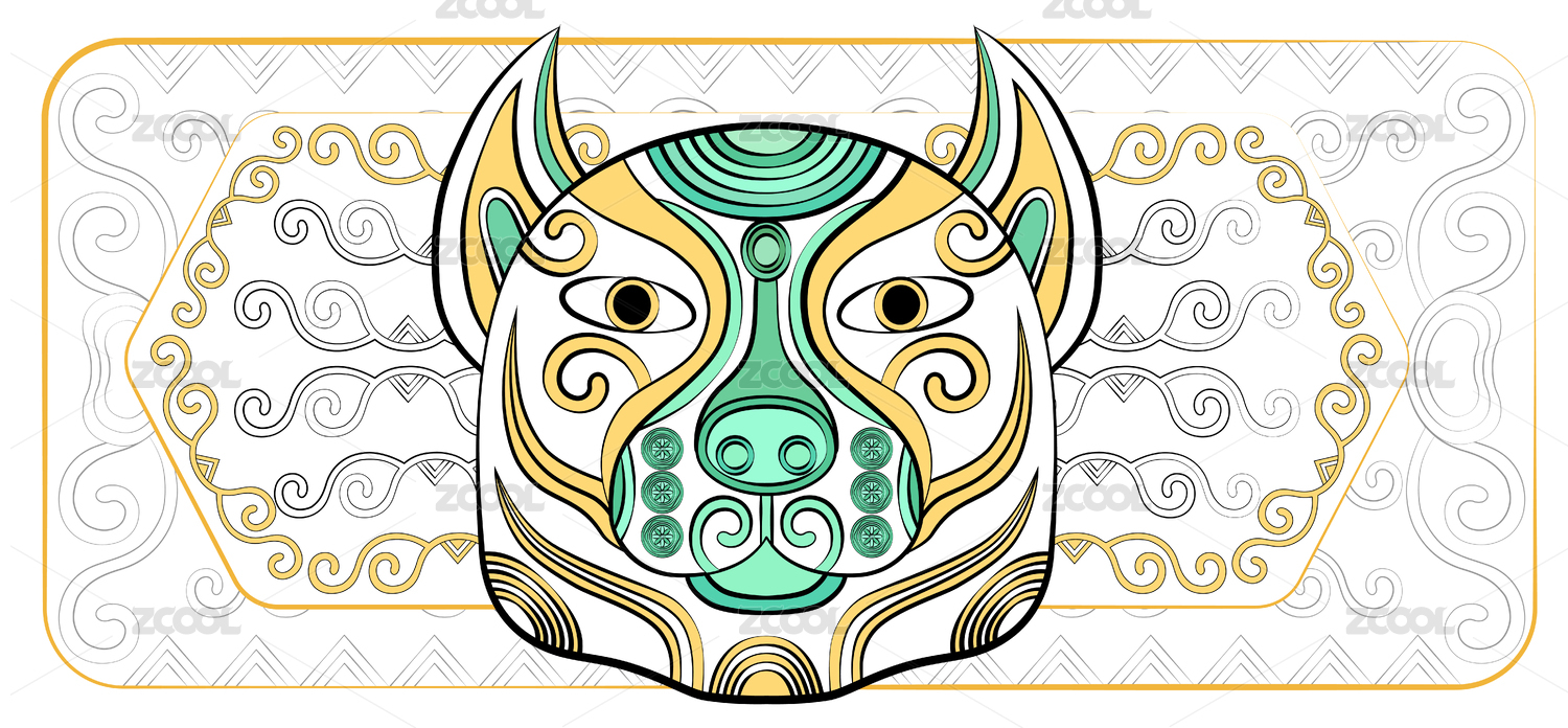 十二生肖猪潮流金色中国风传统纹样矢量插画