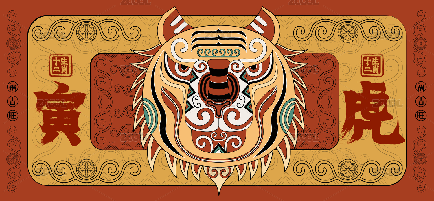 国潮寅虎十二生肖潮流纹样线描装饰卡通形象