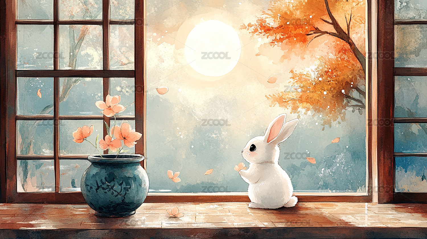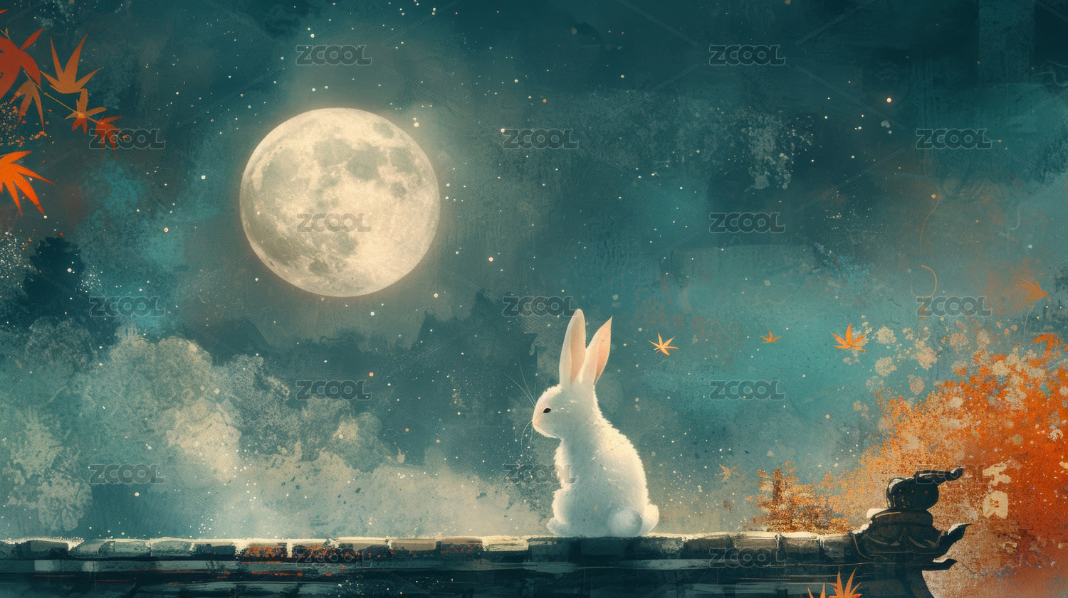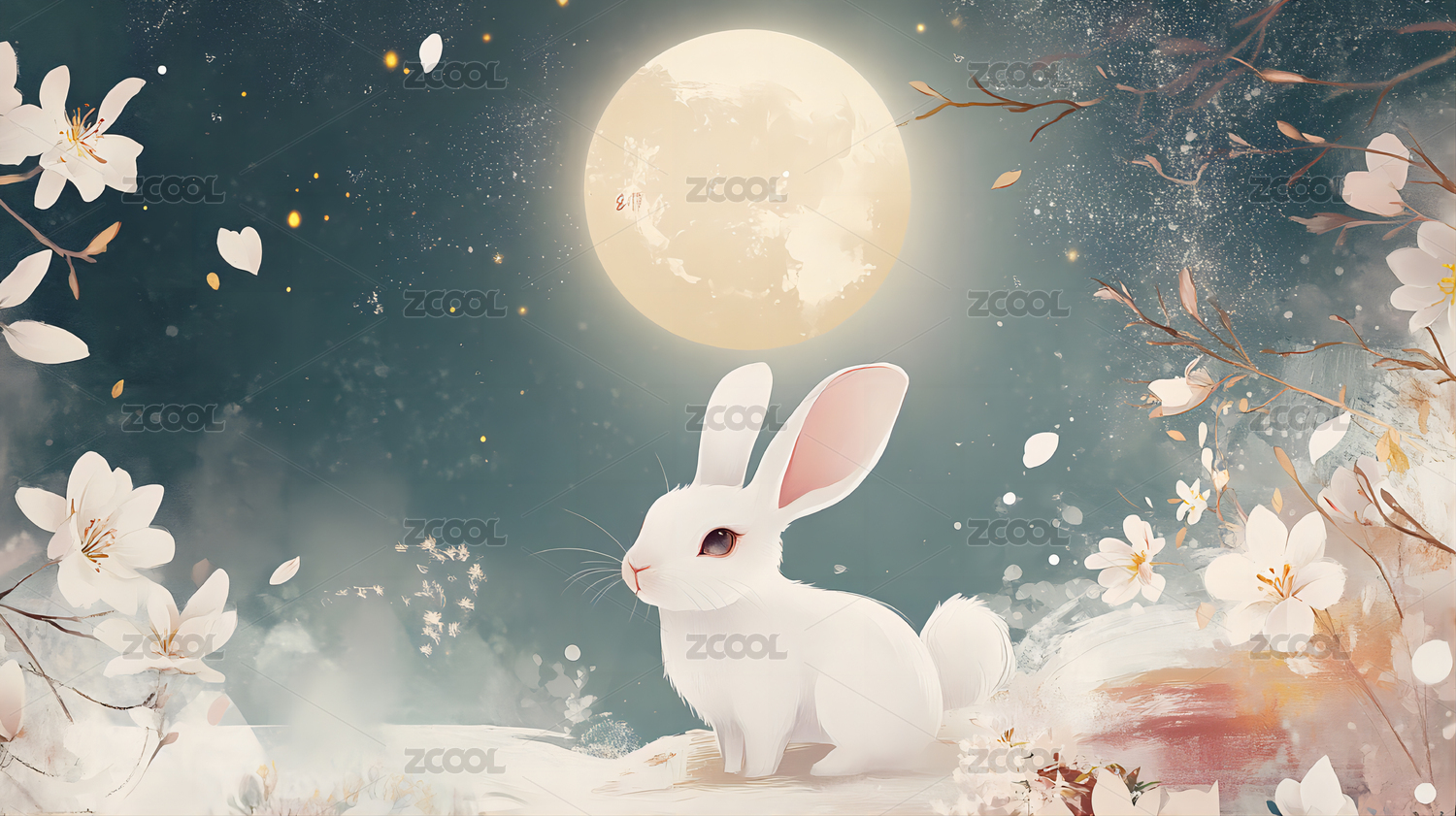 手绘中秋满月下的玉兔