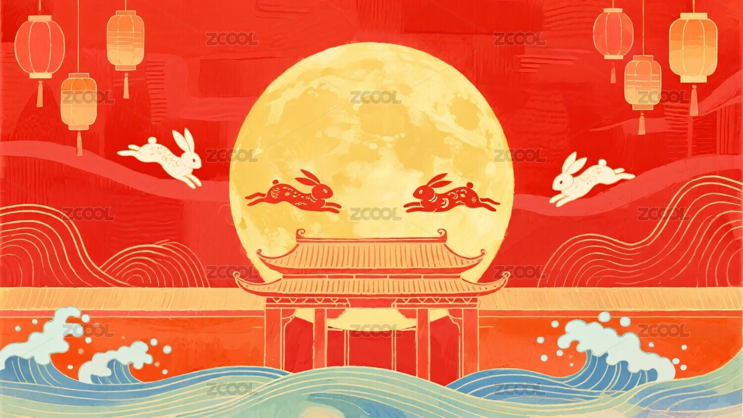 古建筑国潮节日背景插画