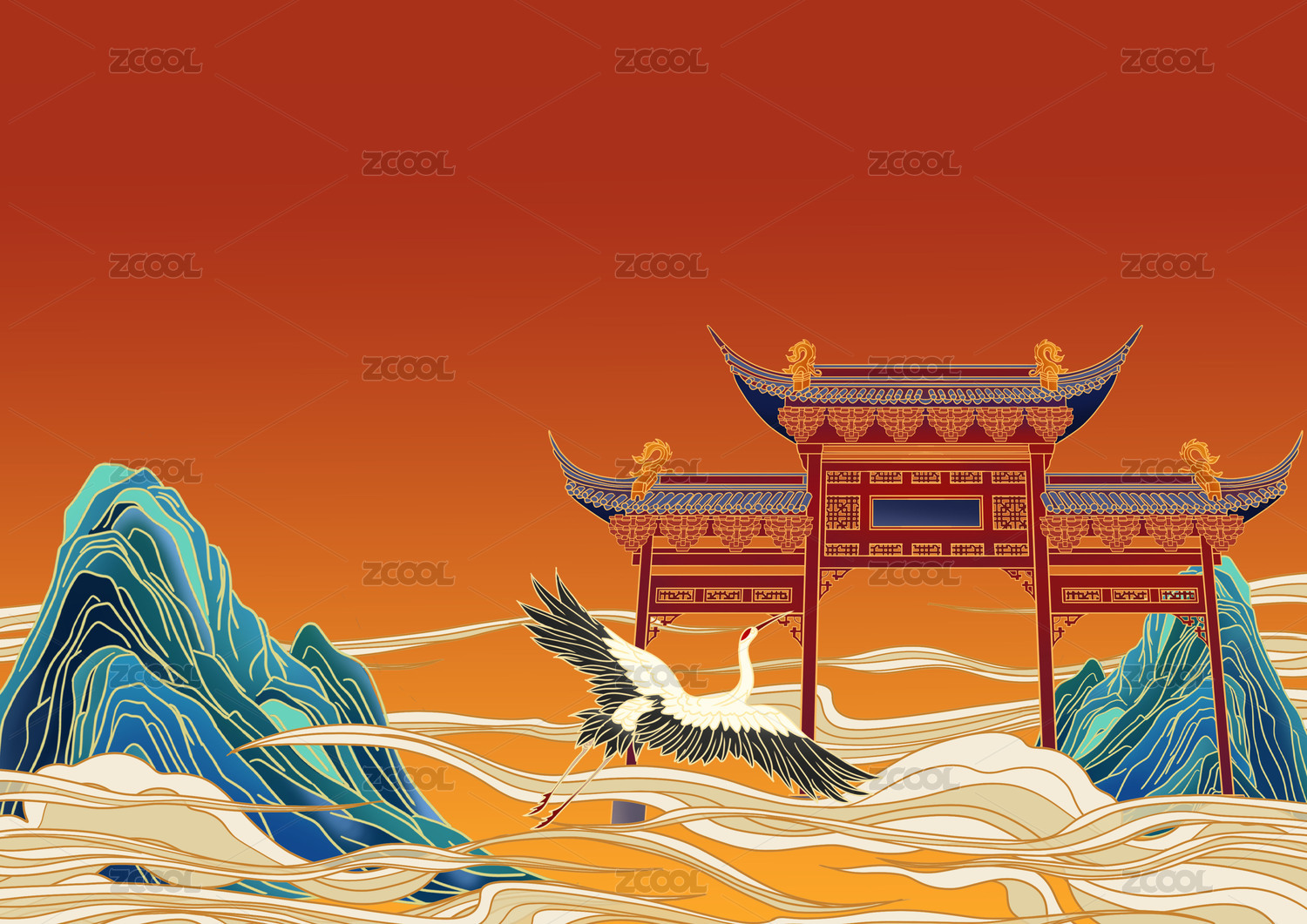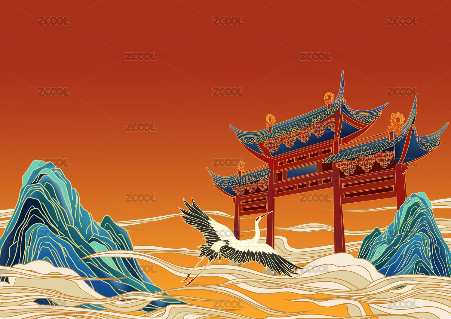 橙色古建筑和仙鹤国潮山水插画