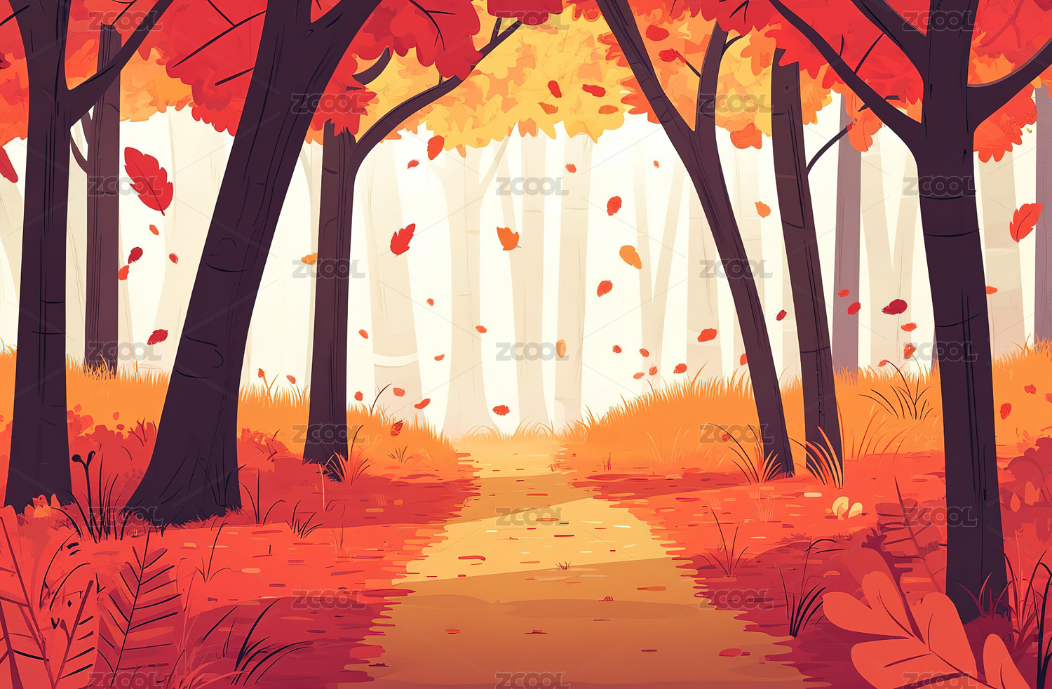 秋天,风景,插画,树,树叶,黄色,氛围,秋季,AIGC202402,林间