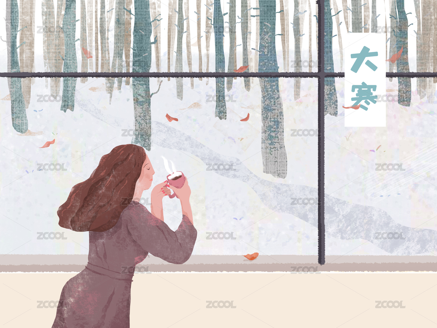 大寒节气腊八节女孩吃腊八粥赏雪景插画