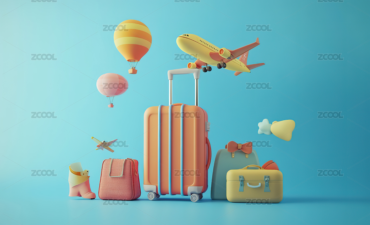 3D渲染的卡通旅行用品组合场景