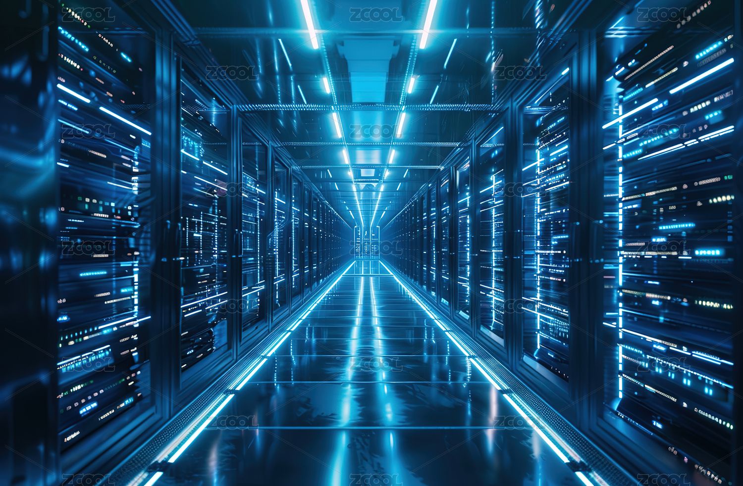 蓝色光线照耀下的服务器机房走廊