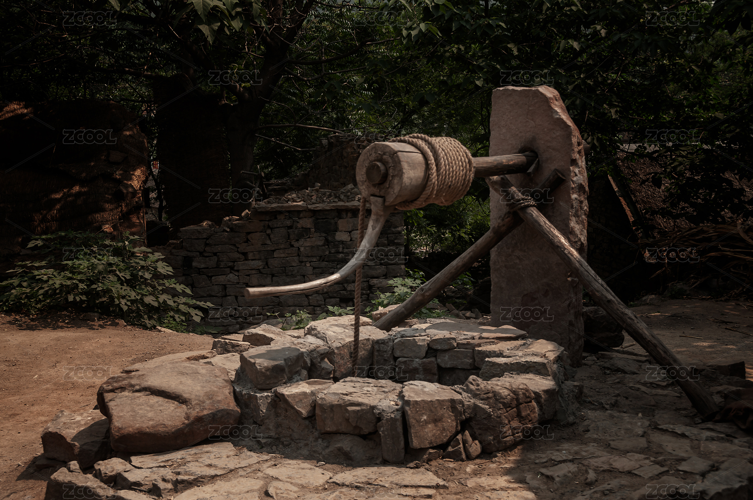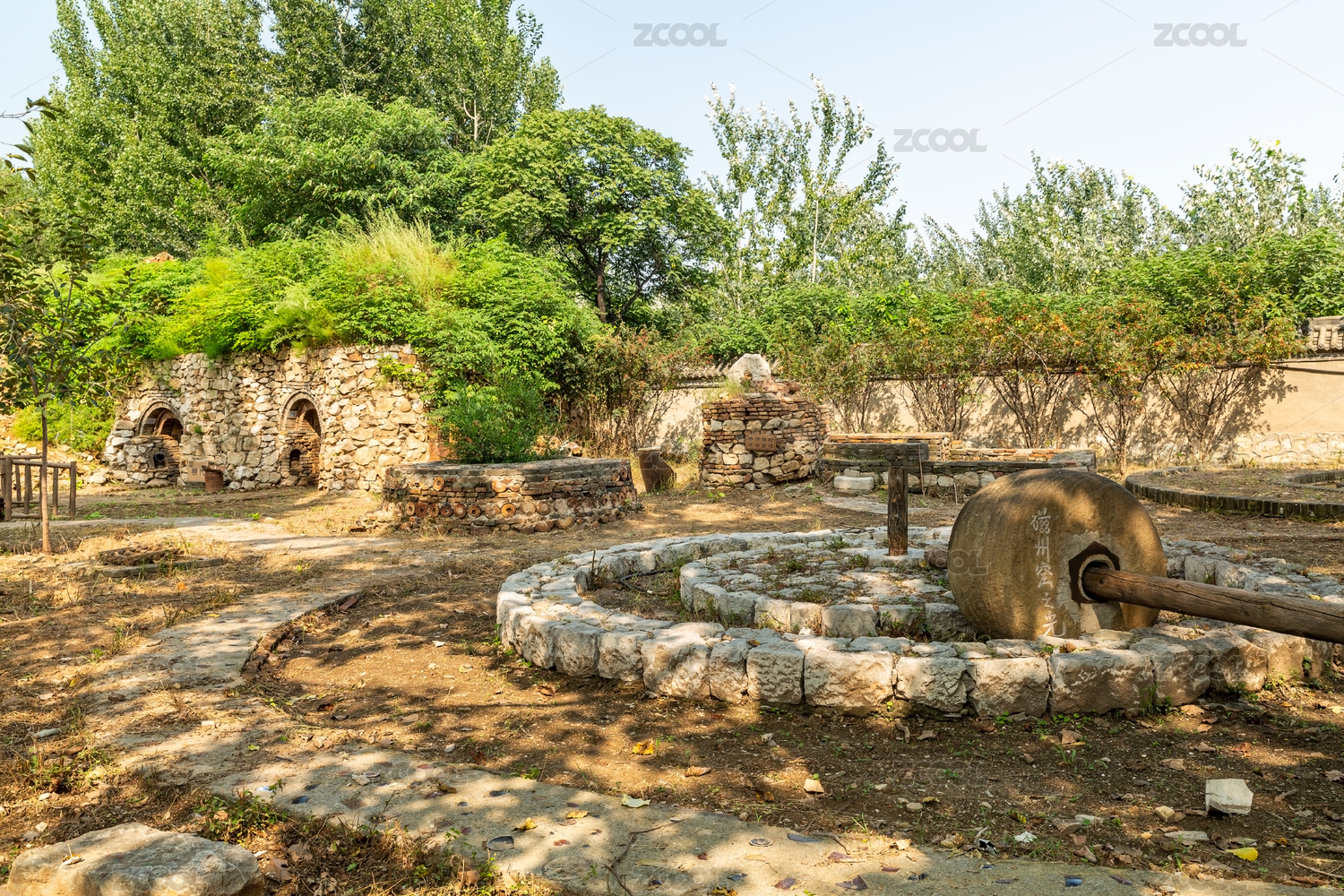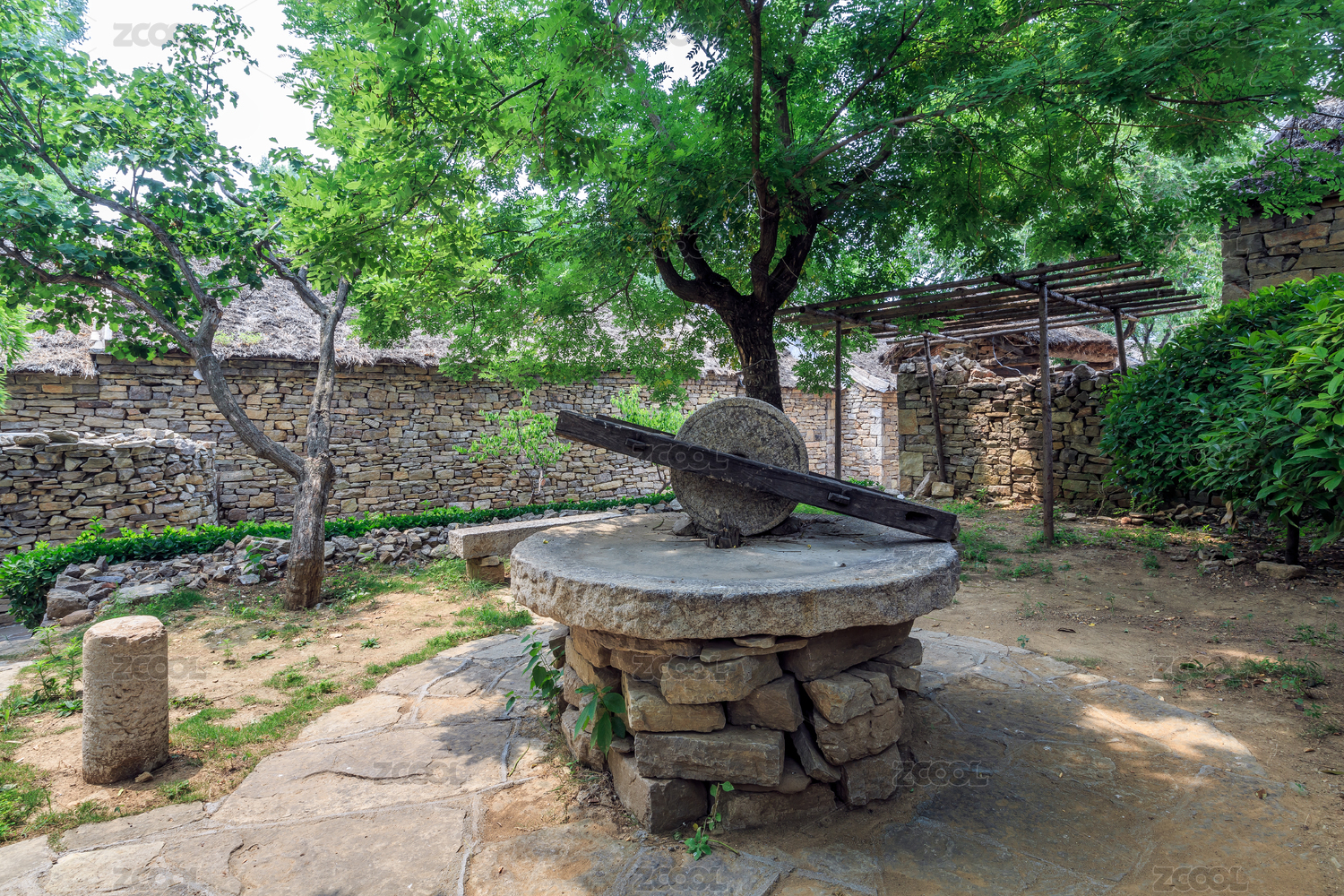 中国山东省临沂市沂蒙红色影视基地内沂蒙山村的石碾子