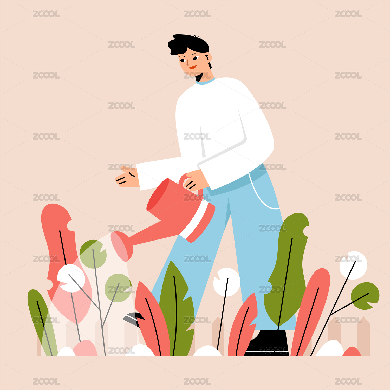 春天到了少年给花朵浇水