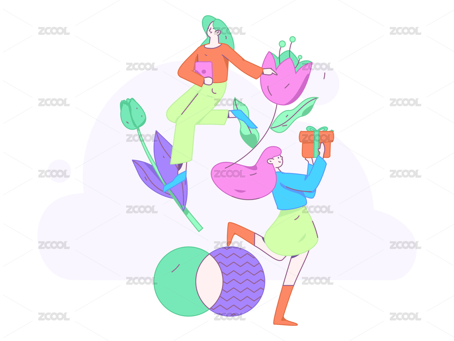 扁平风格春季三个美女在公园玩耍矢量插画