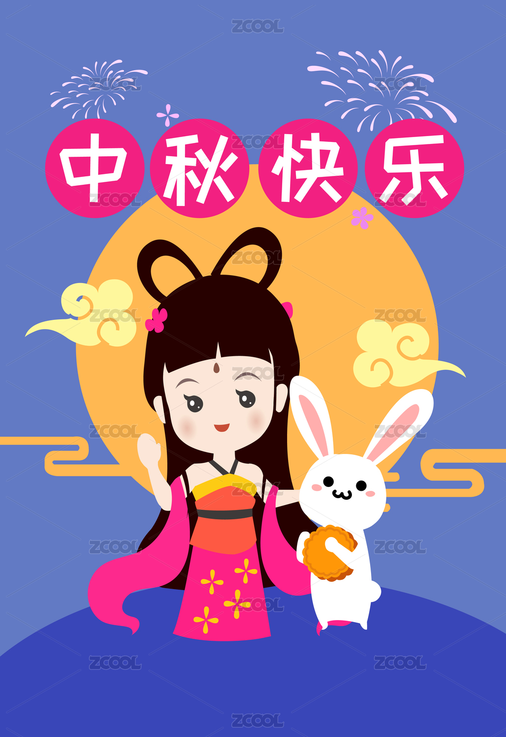 中秋节嫦娥奔月兔子月饼插画海报