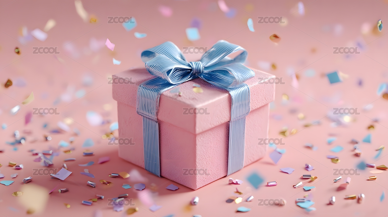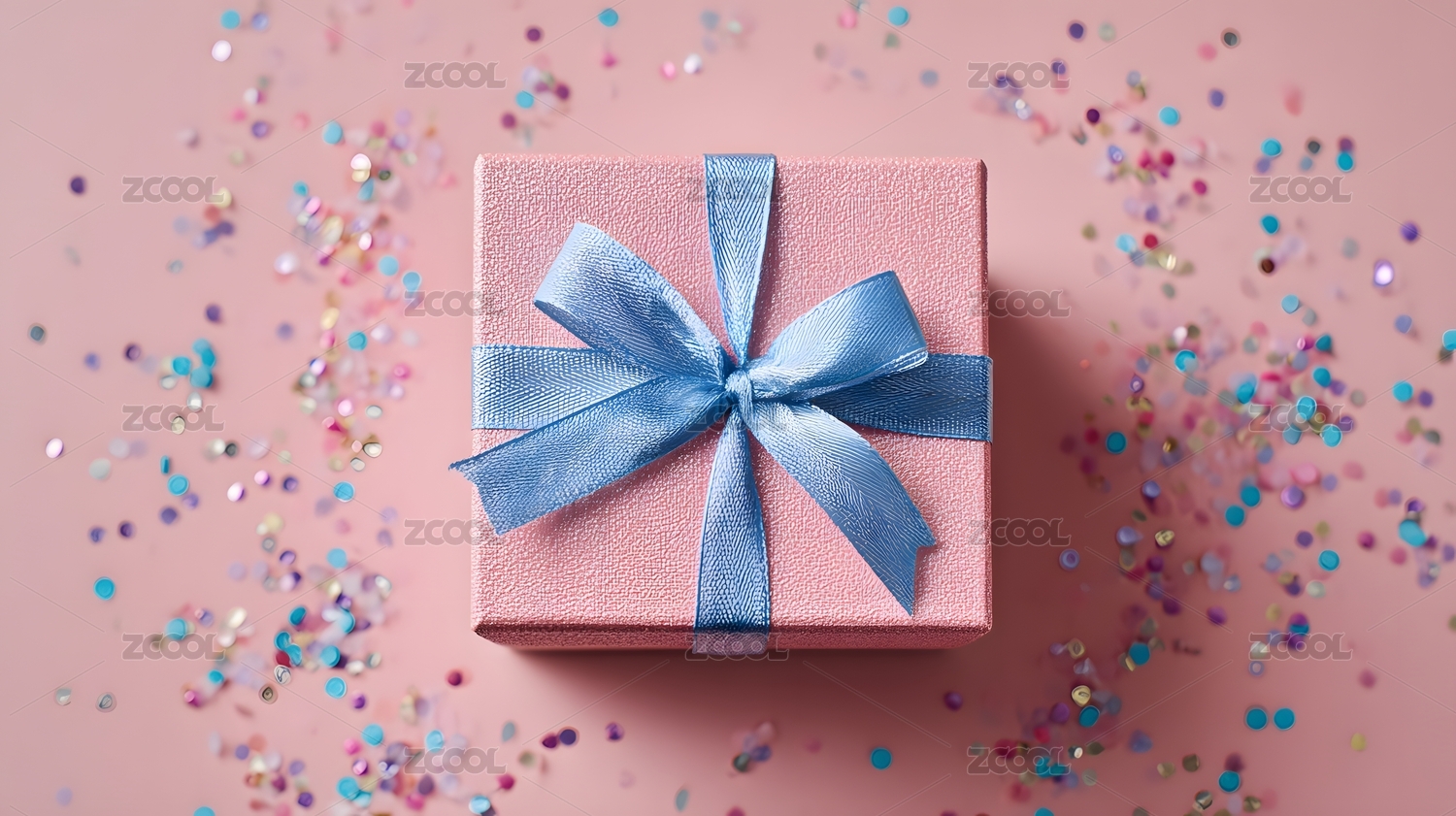 粉色礼盒与蓝色蝴蝶结和缤纷纸屑