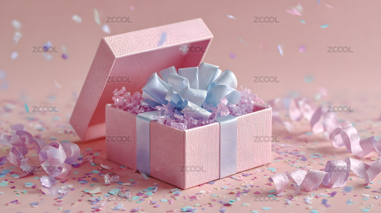 粉色礼物盒打开,蓝色彩带飘落,浪漫场景