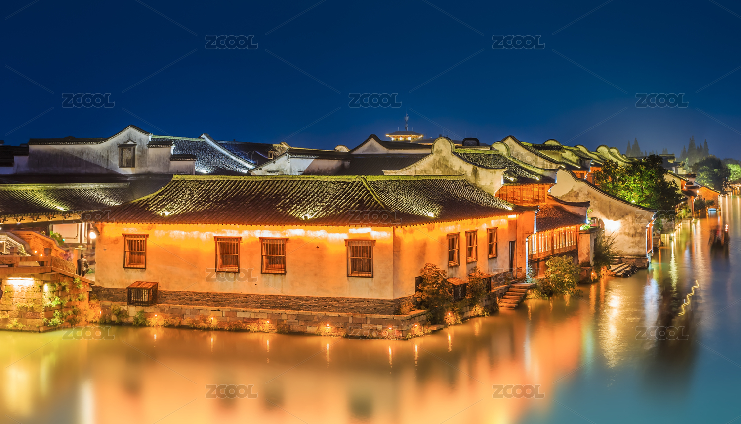 美丽的苏州周庄古镇夜景风光