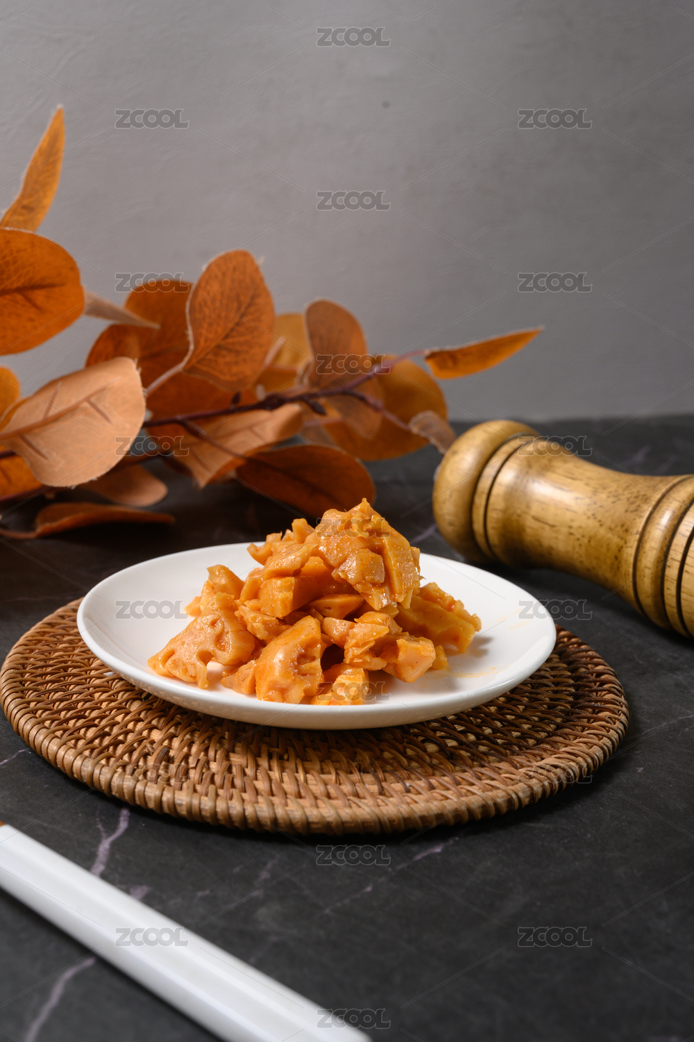 桌面想的盘子里的美味可口的香辣藕丁