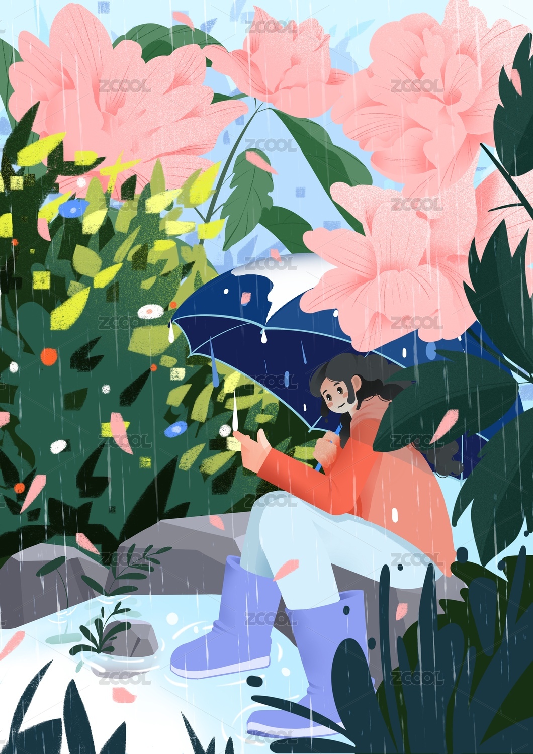 春季谷雨节气下雨天躲在花丛中手握花的女孩