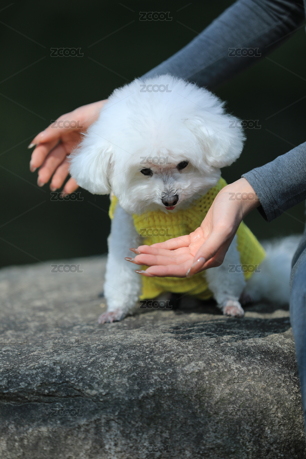 一个人正在给宠物狗比熊犬喂零食