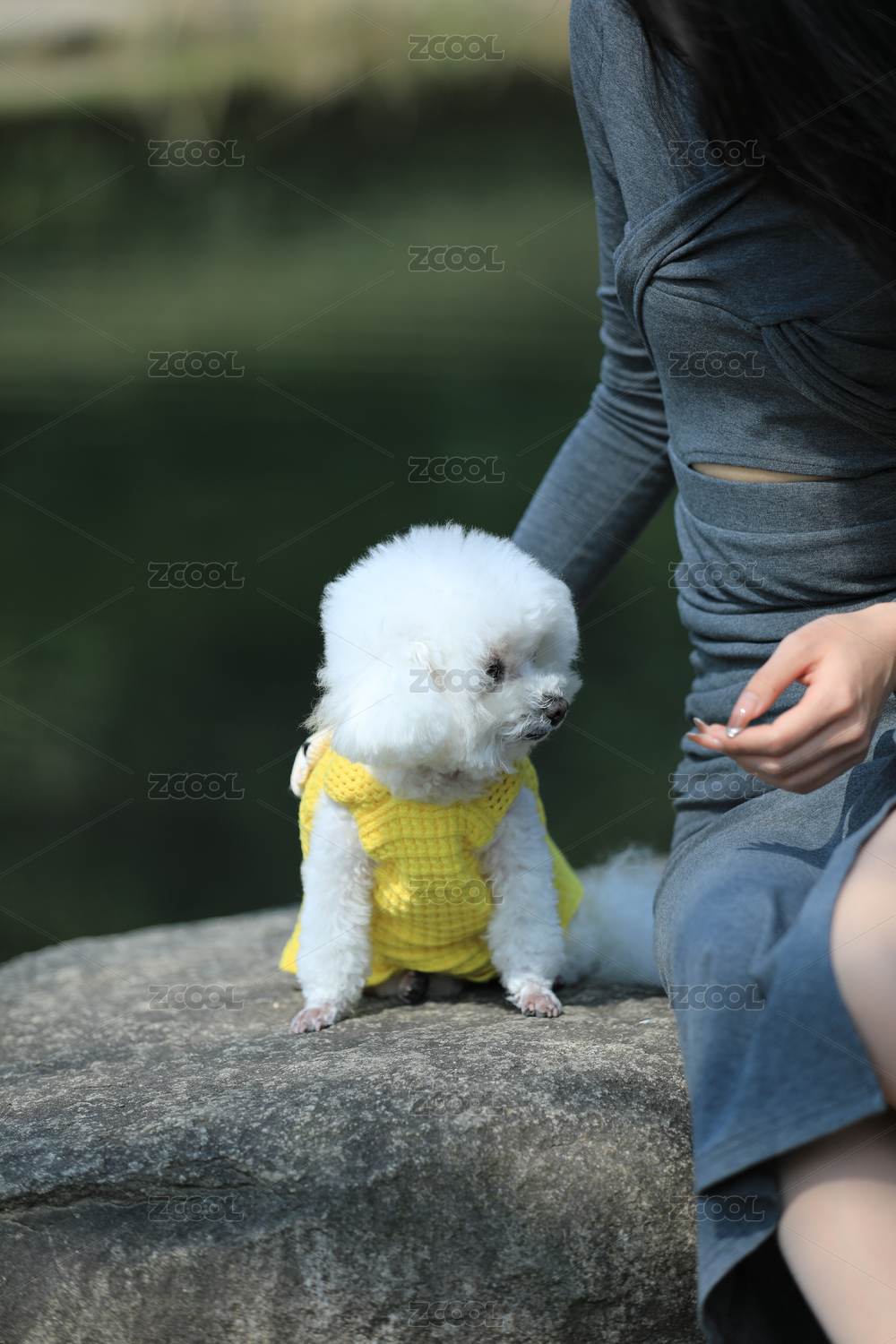 坐在公园湖边可爱的宠物狗比熊犬