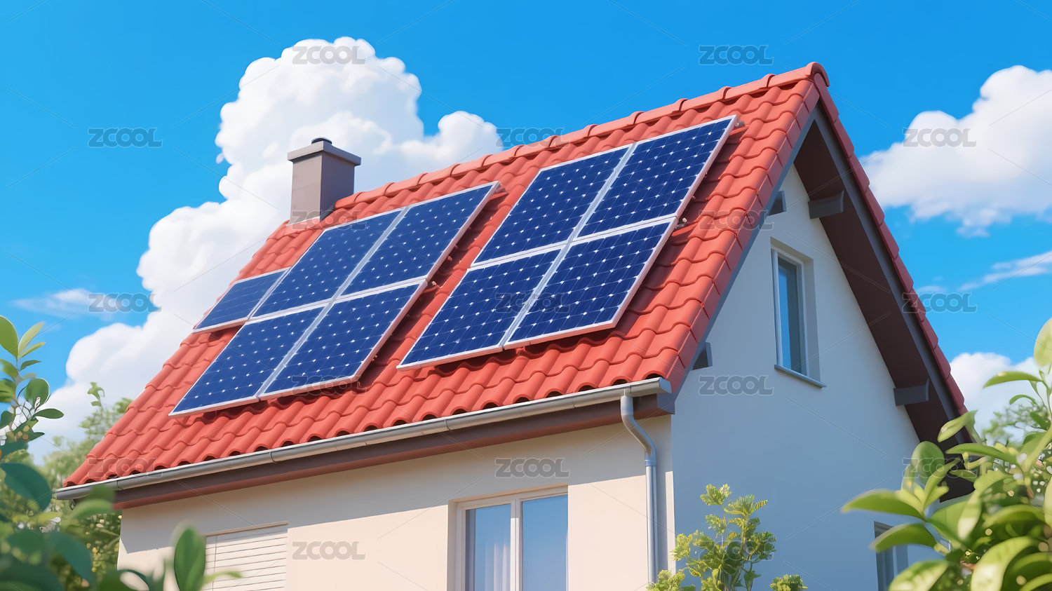 带有太阳能板的红色屋顶房屋