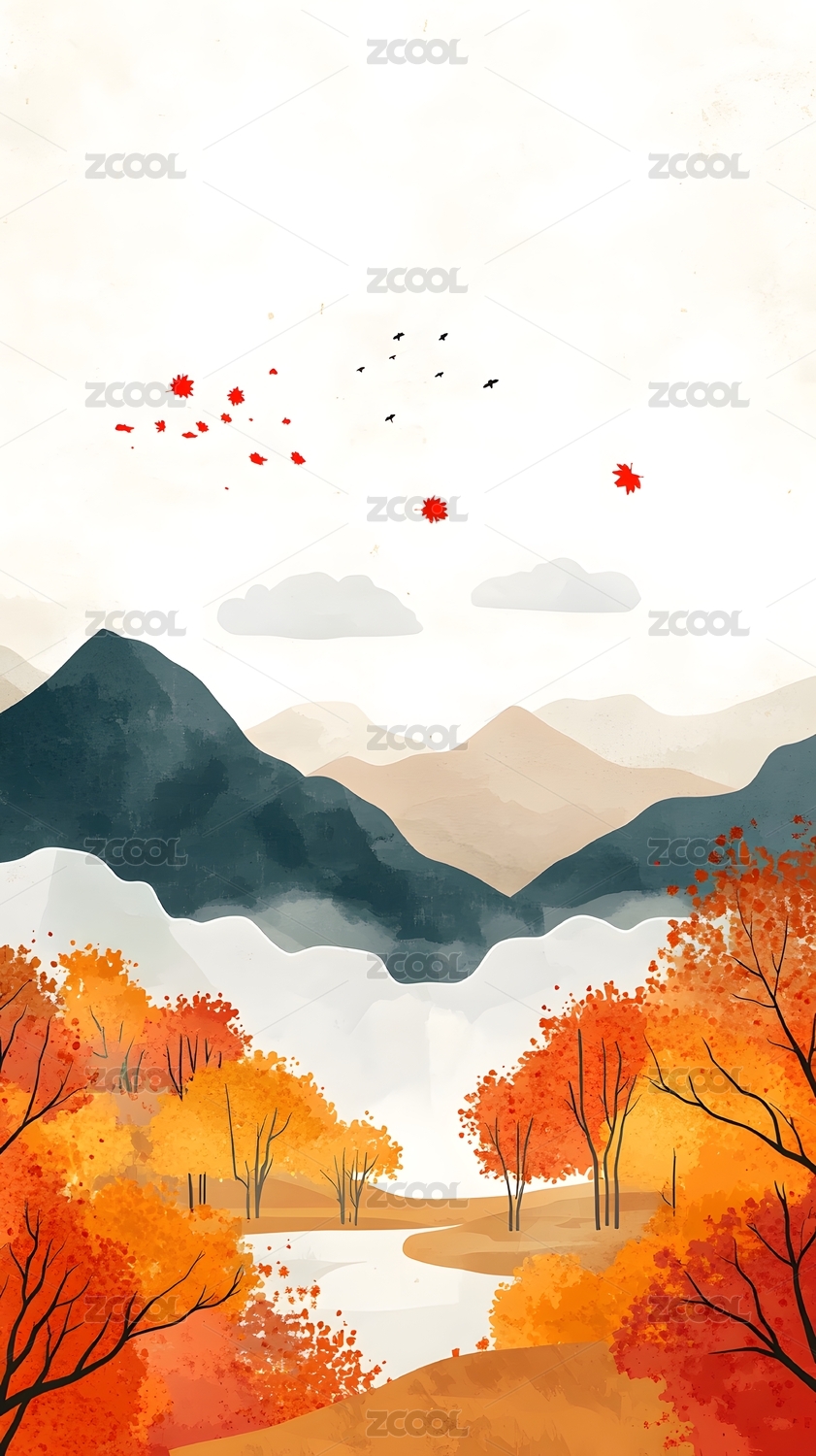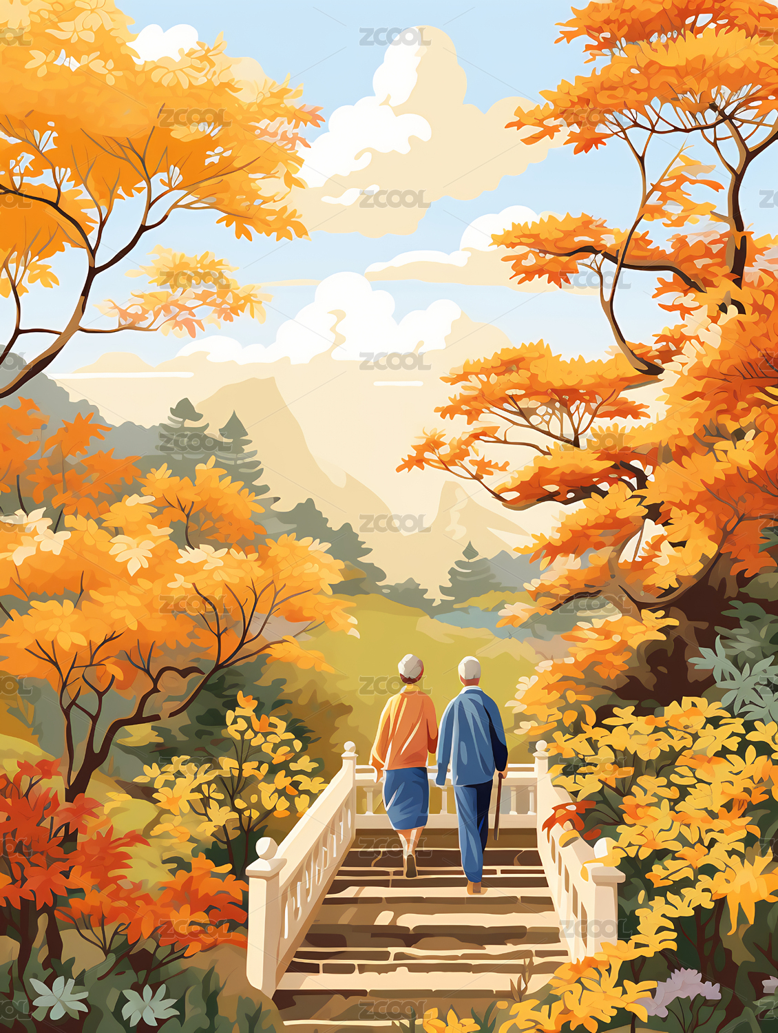 AIGC202402,扁平,水彩,秋天,写意,枫叶,漫步,散步