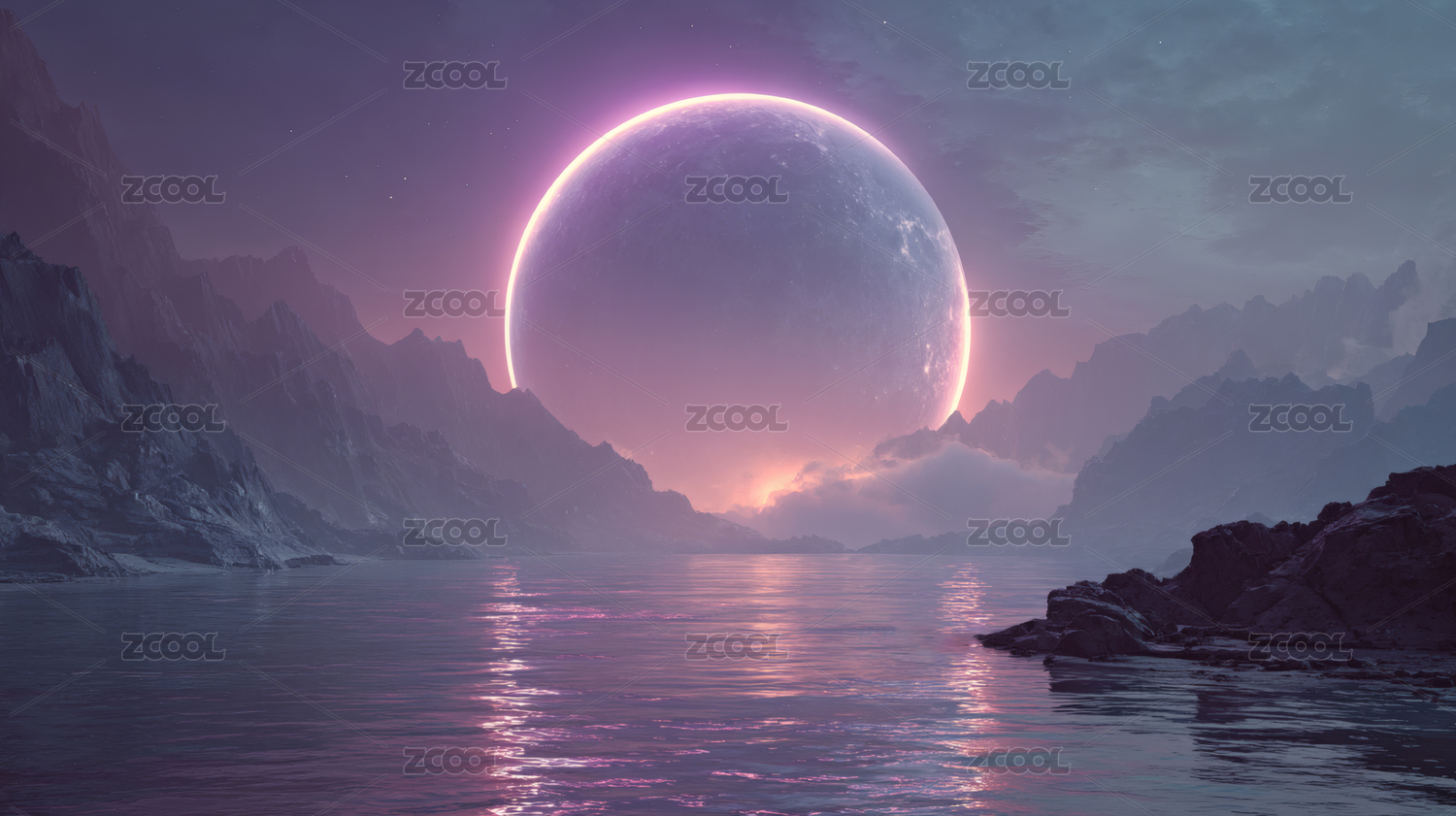 粉色霓虹映衬的海面光环