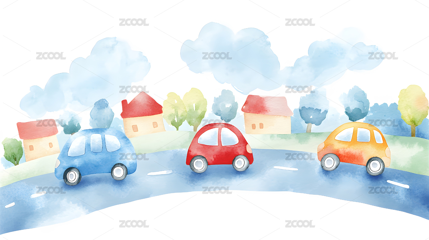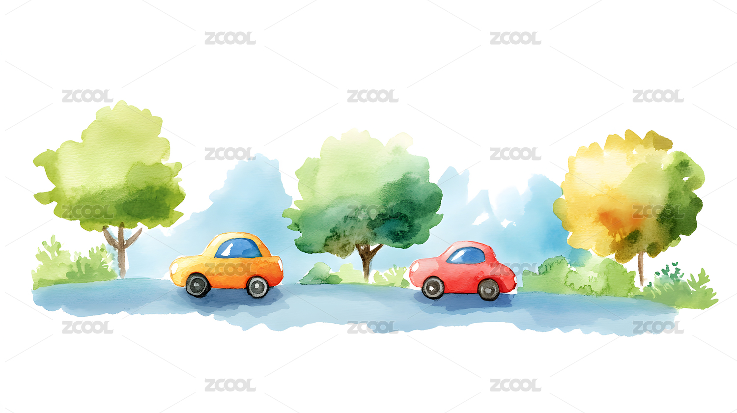 水彩画风格的童趣汽车图