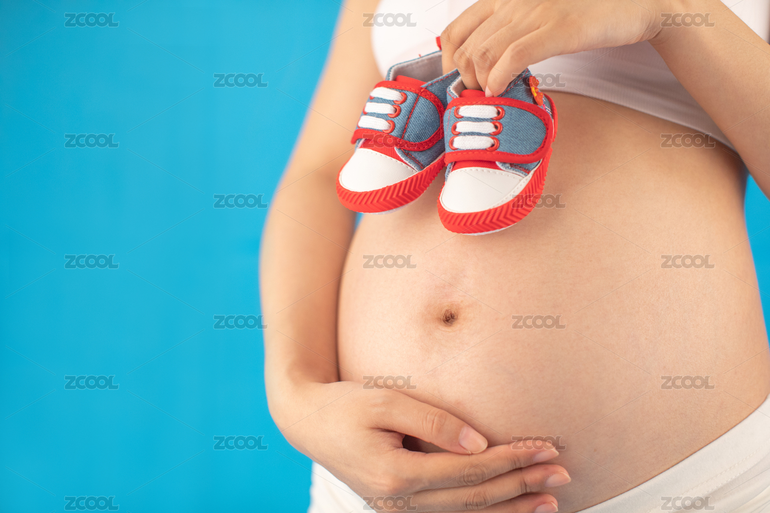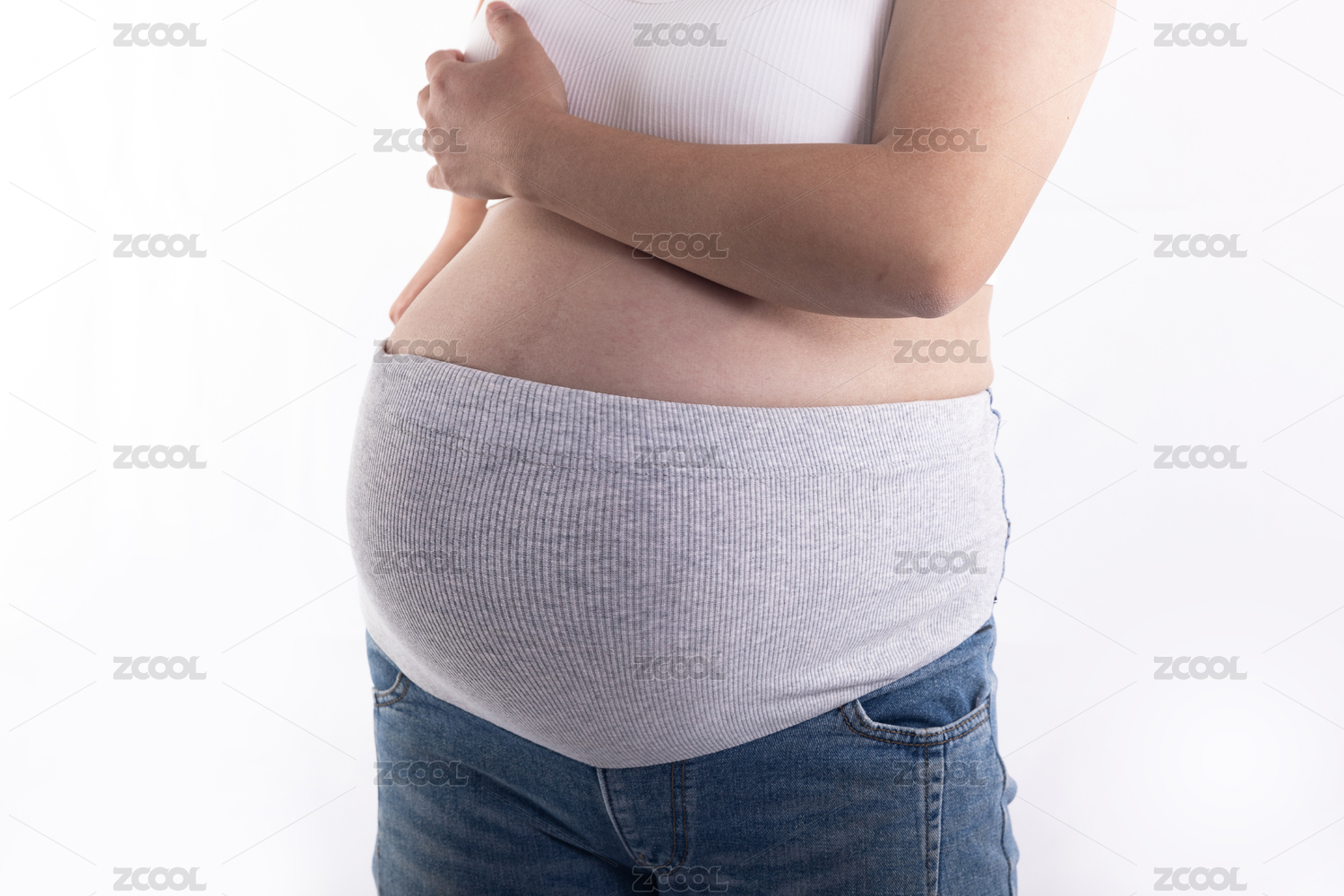 白色背景前的孕妇侧着身站着正在穿孕妇裤