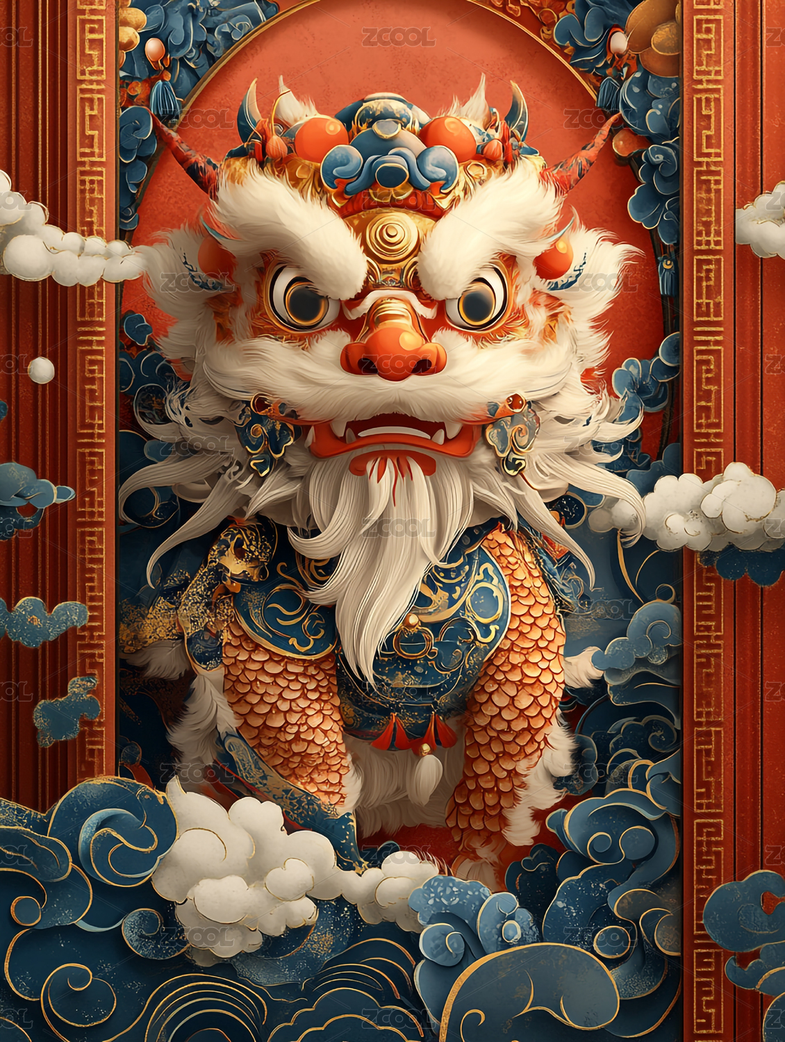 3d立体风格中国年国潮醒狮龙头壁纸插画