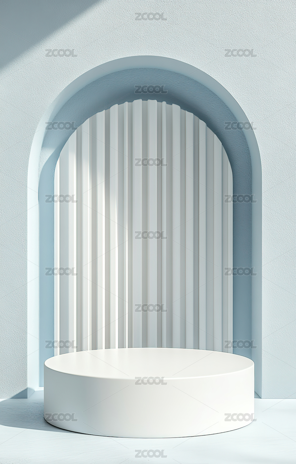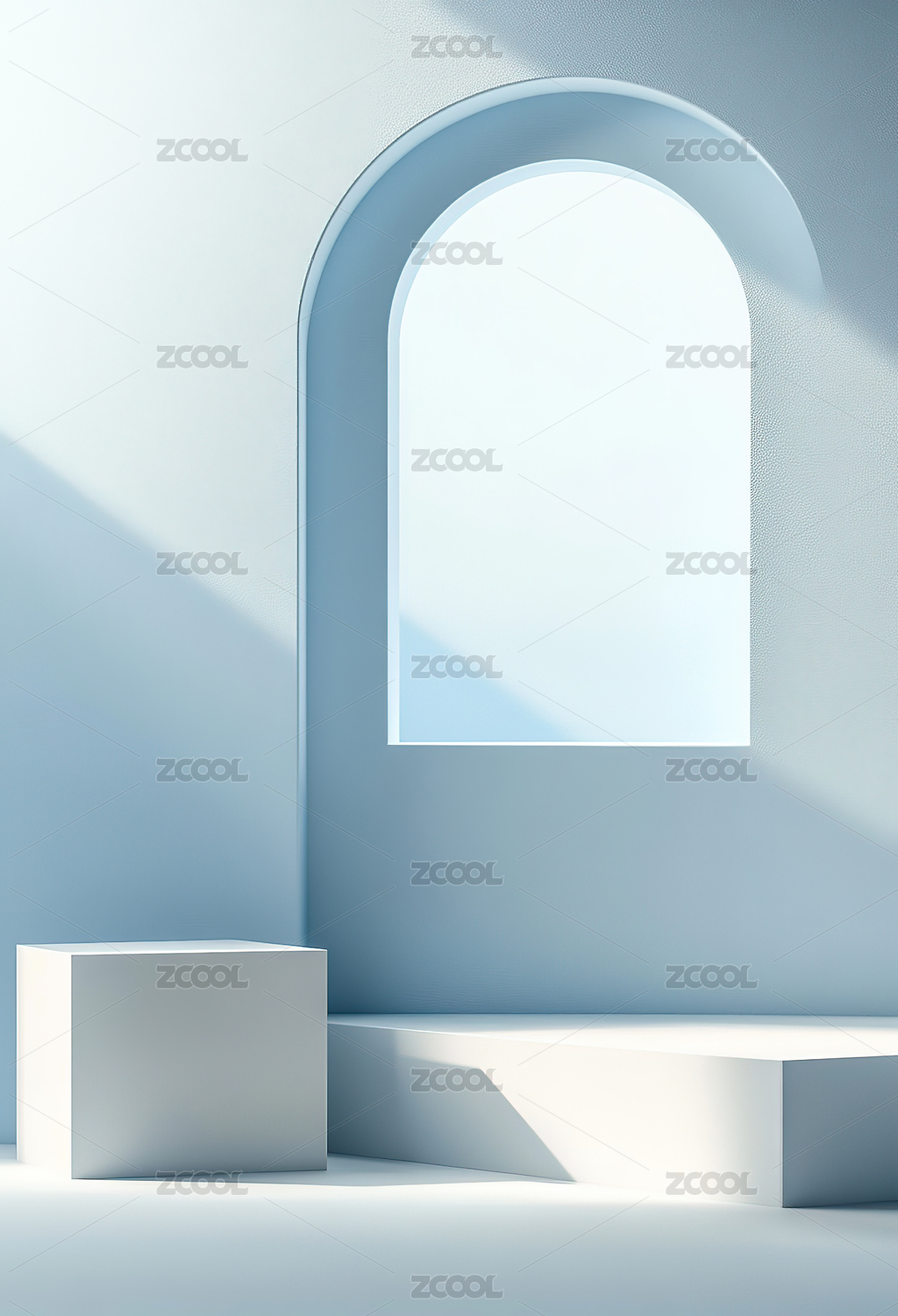 白色阶梯平台与拱形窗的光影场景