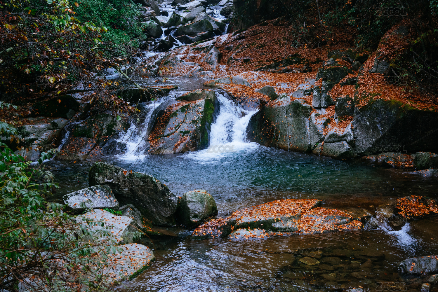 高山深秋清澈的溪水和红叶