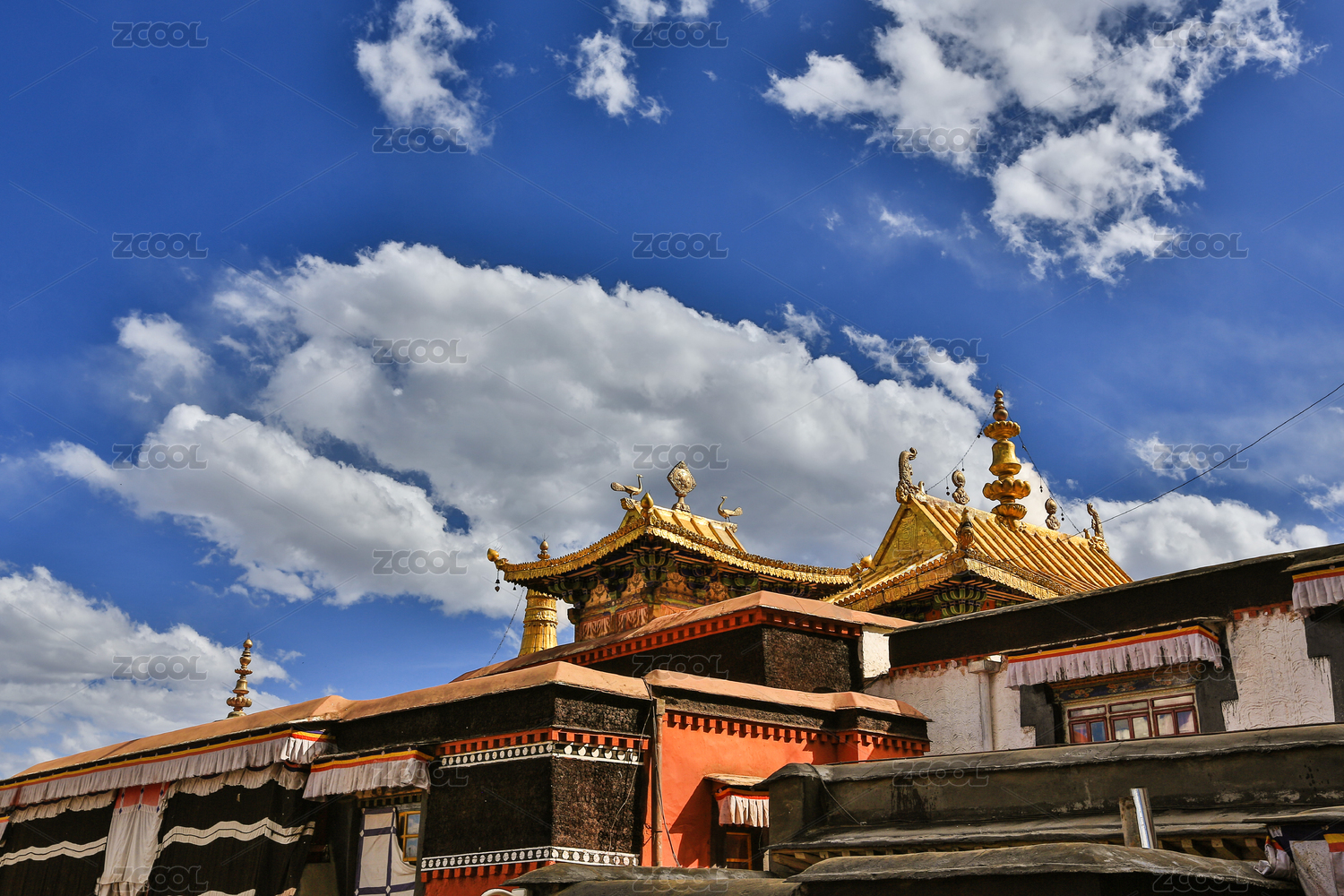 藏式寺庙屋顶蓝天白云-四川稻城县著杰寺