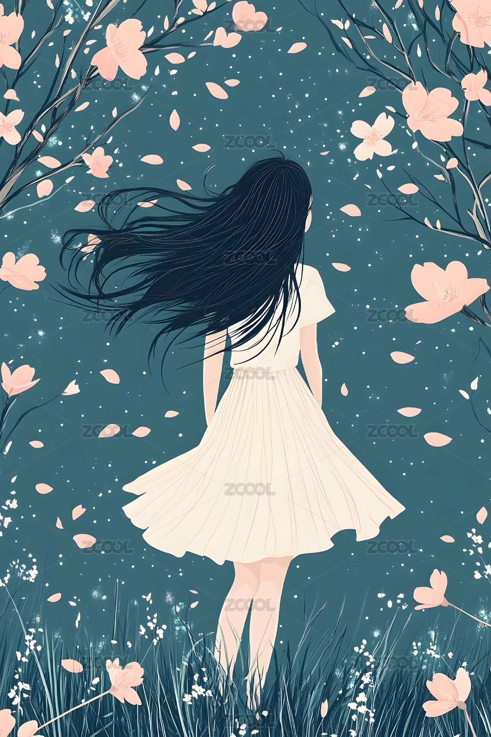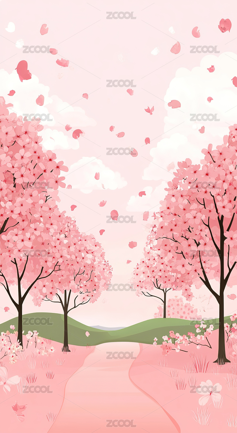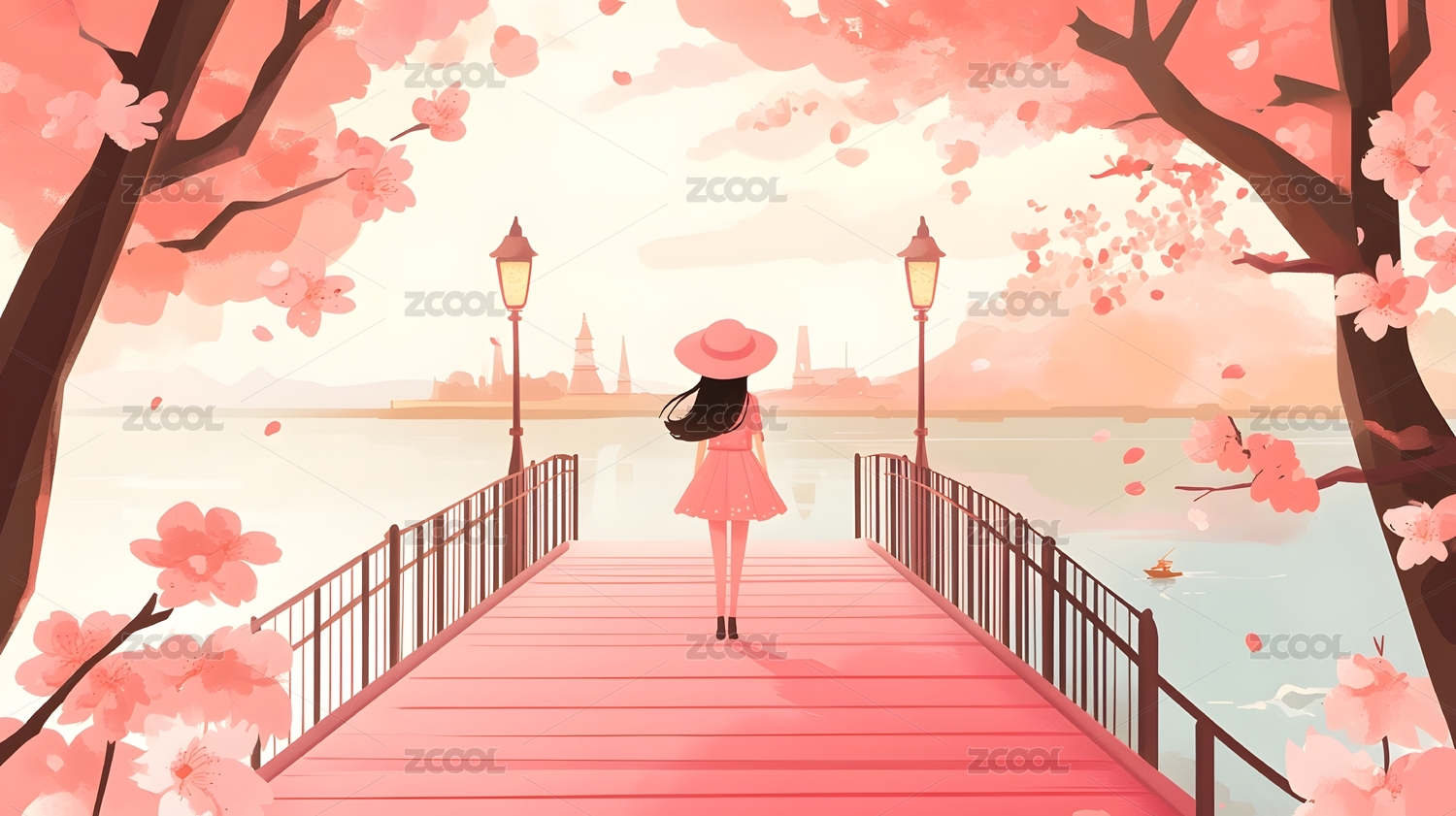 插画,唯美,梦幻,粉色,樱花,女孩,春天,风景,背景,壁纸