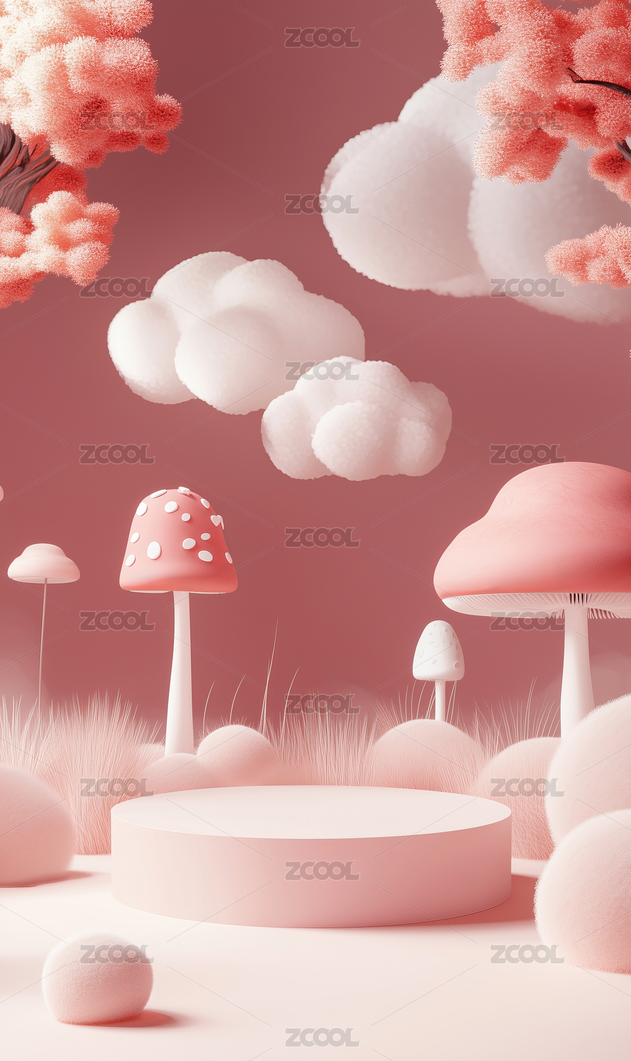 3D粉色卡通蘑菇圆形电商产品展台