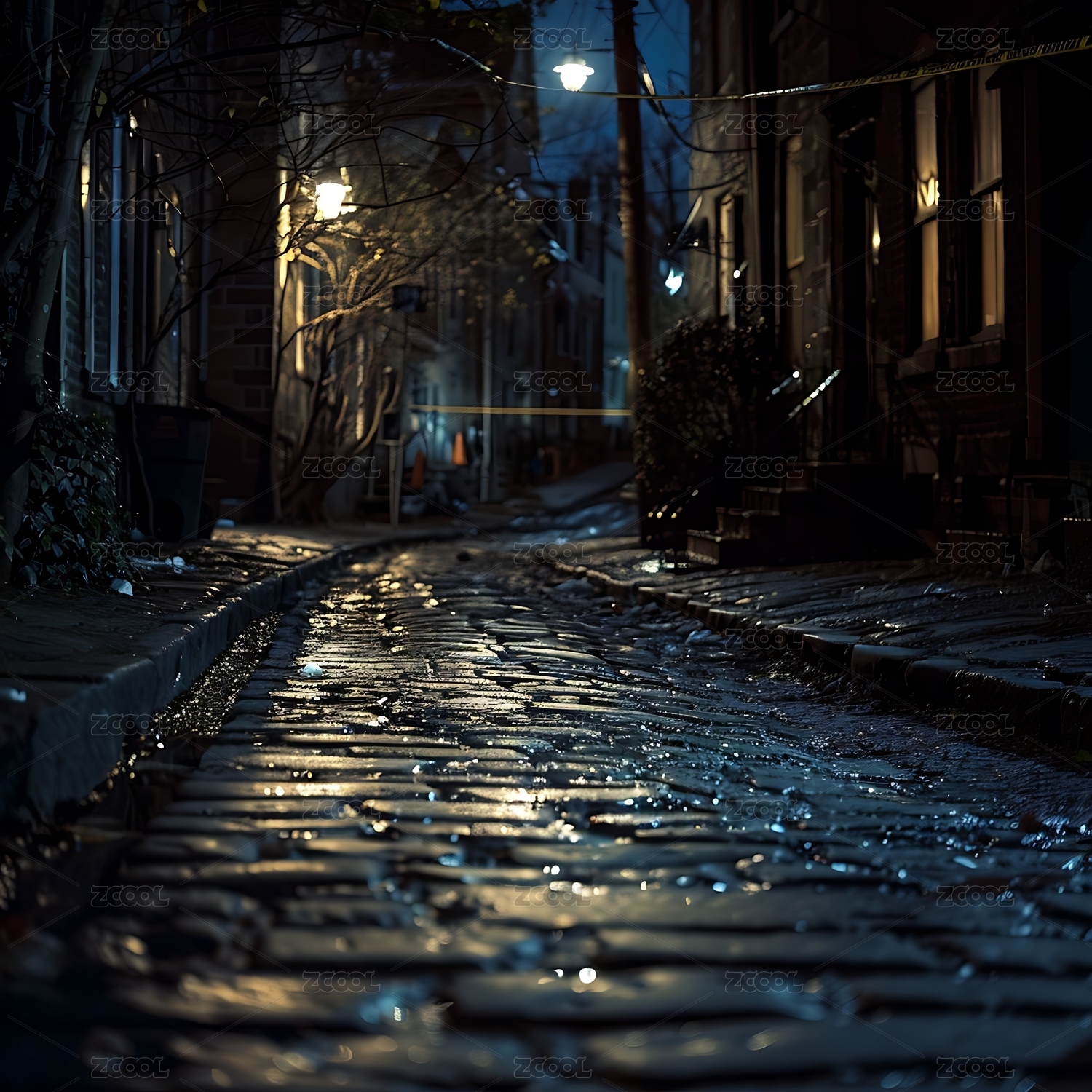 夜晚湿漉漉的路面上泛着红蓝相间的霓虹光晕