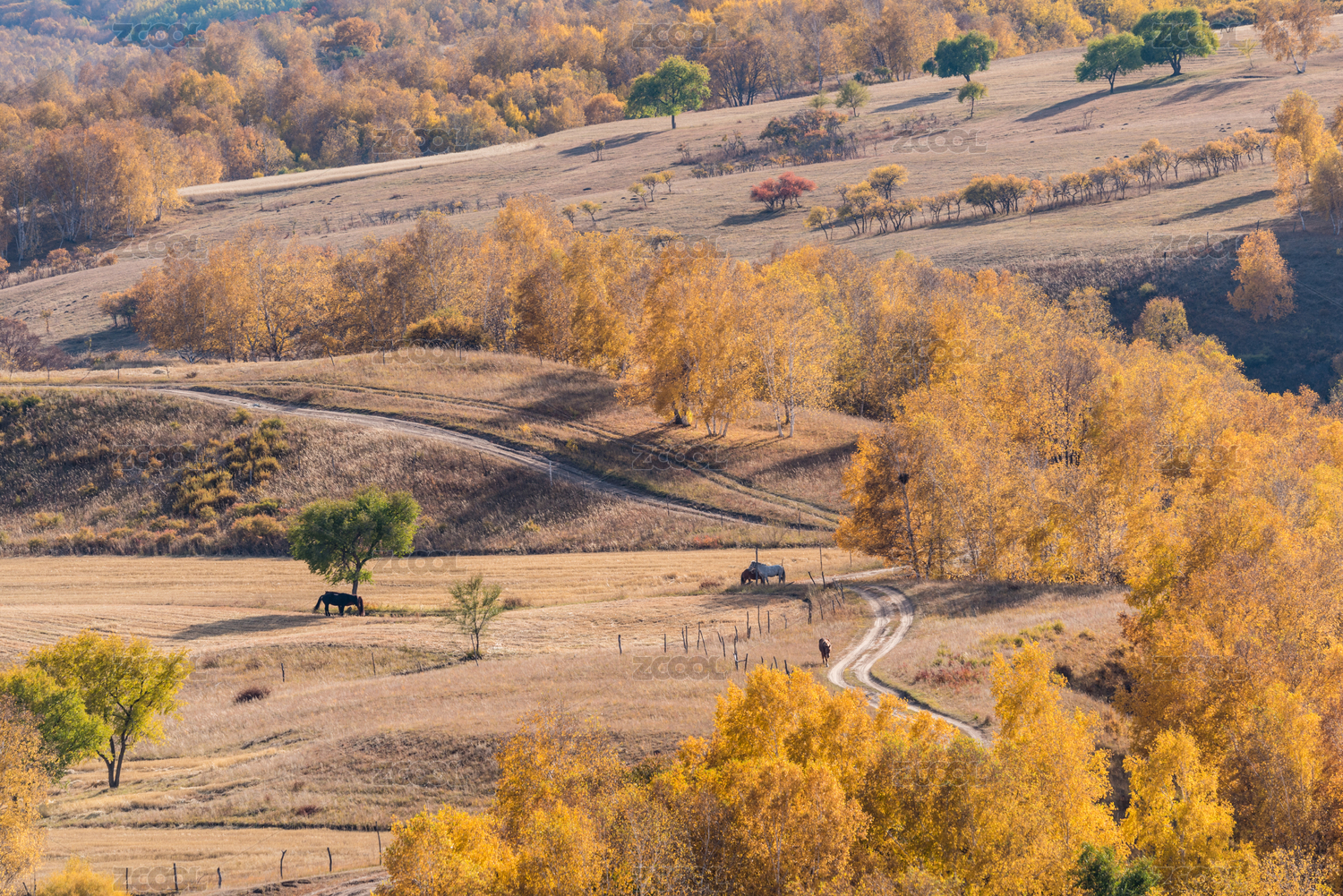 秋天,草原,牛,天空,山,树林,马,中国,内蒙古,赤峰市