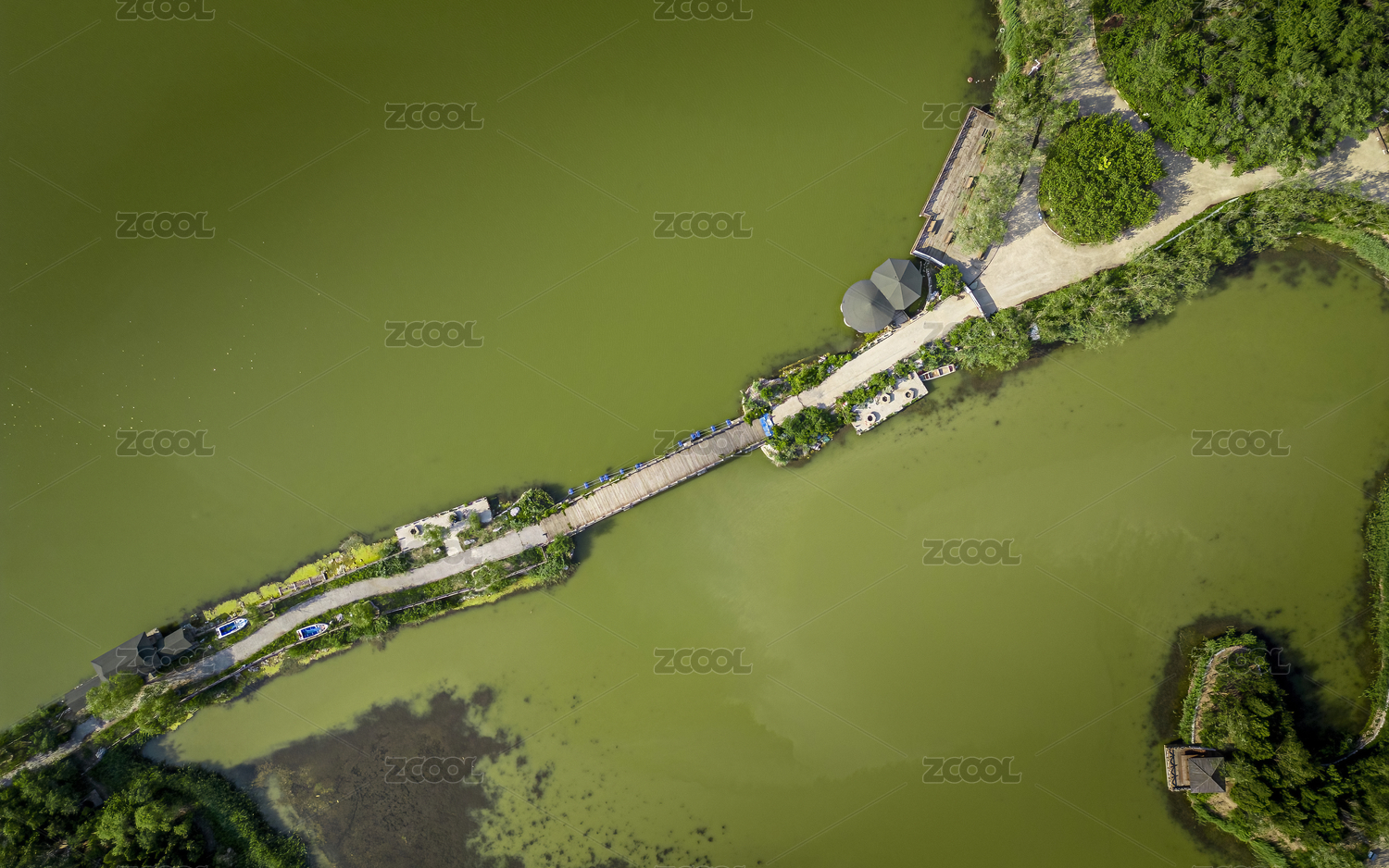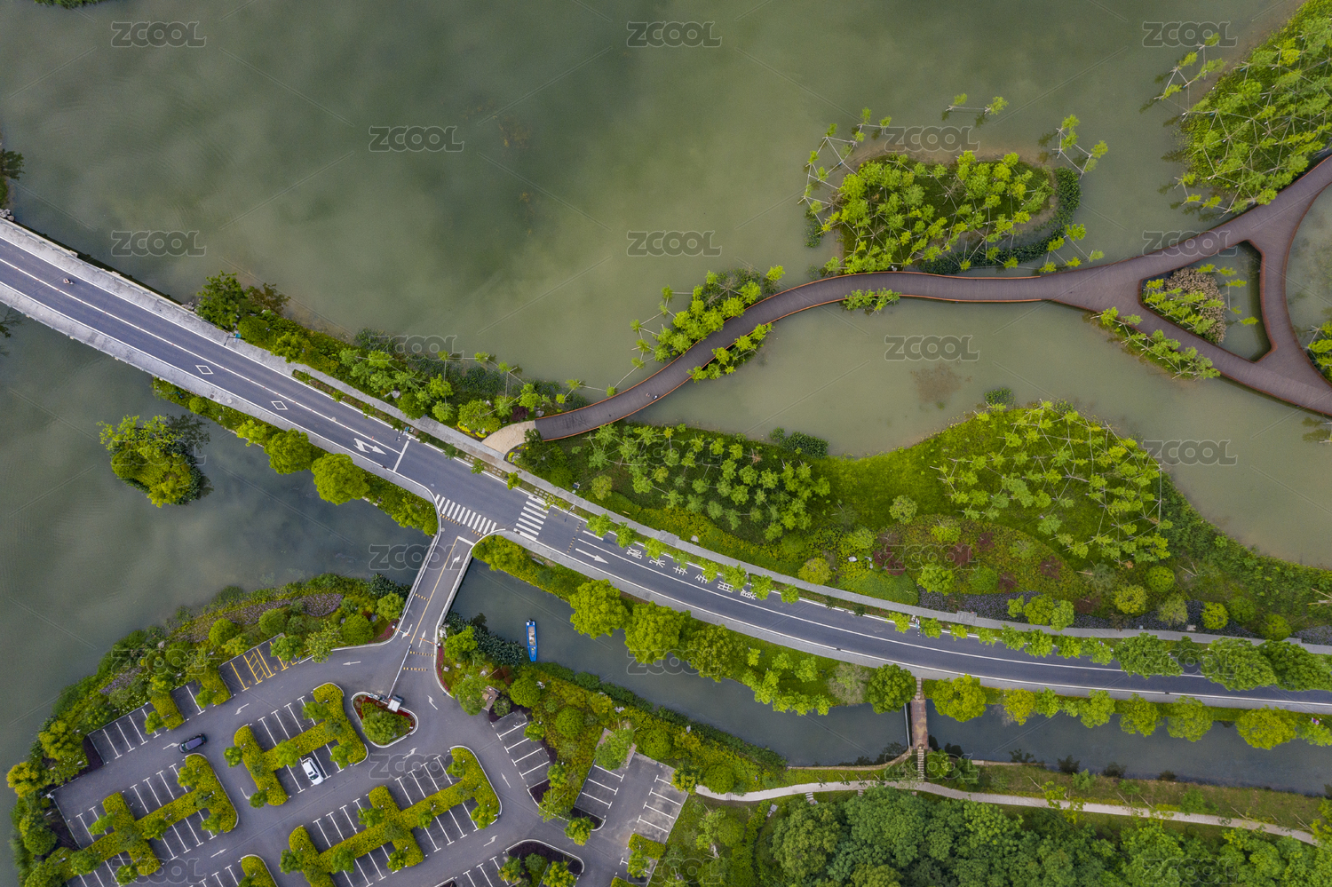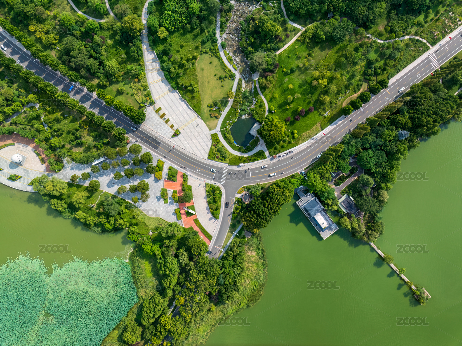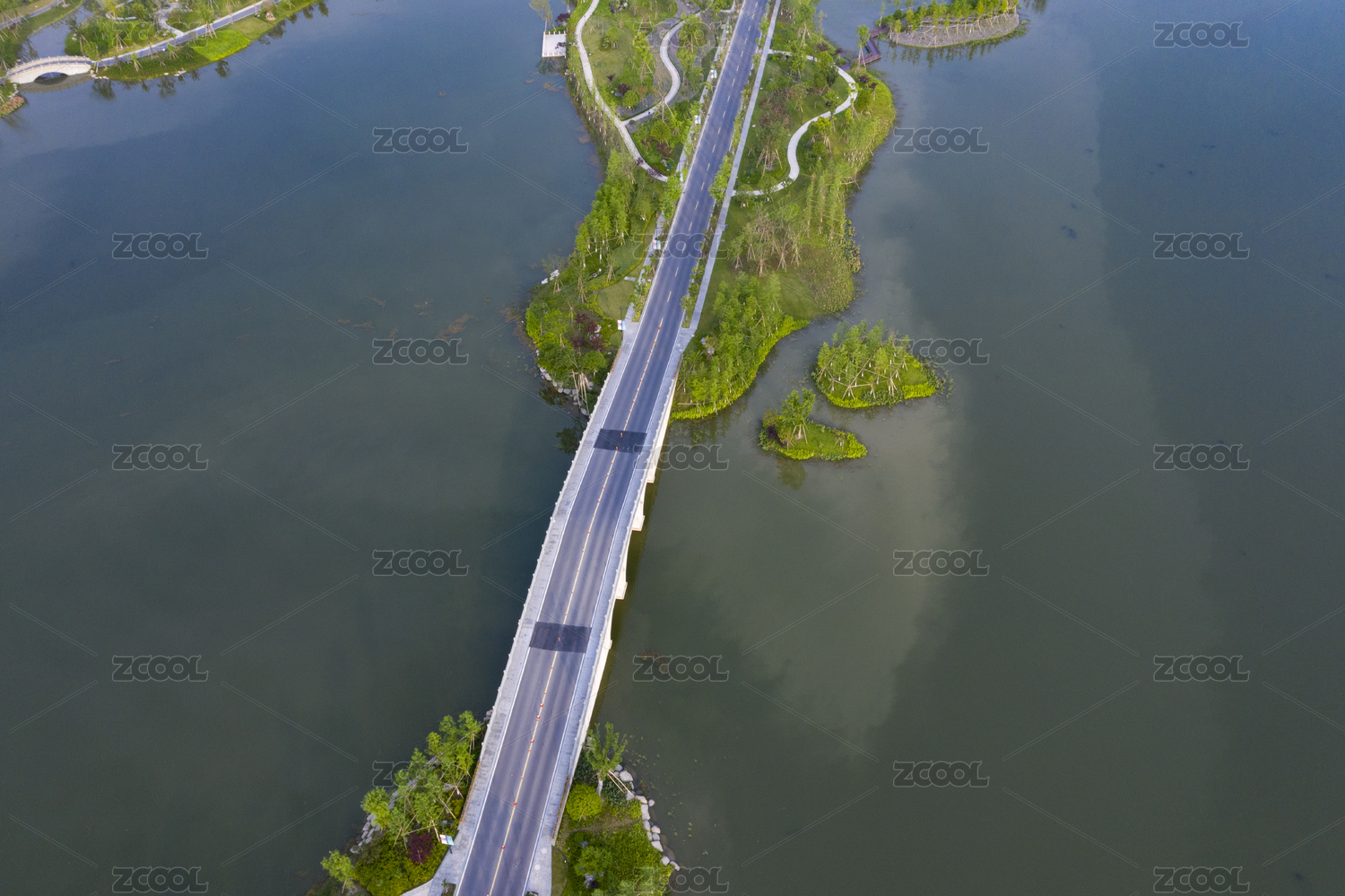 夏季白天正上方视角航拍徐州云龙湖湖上公路