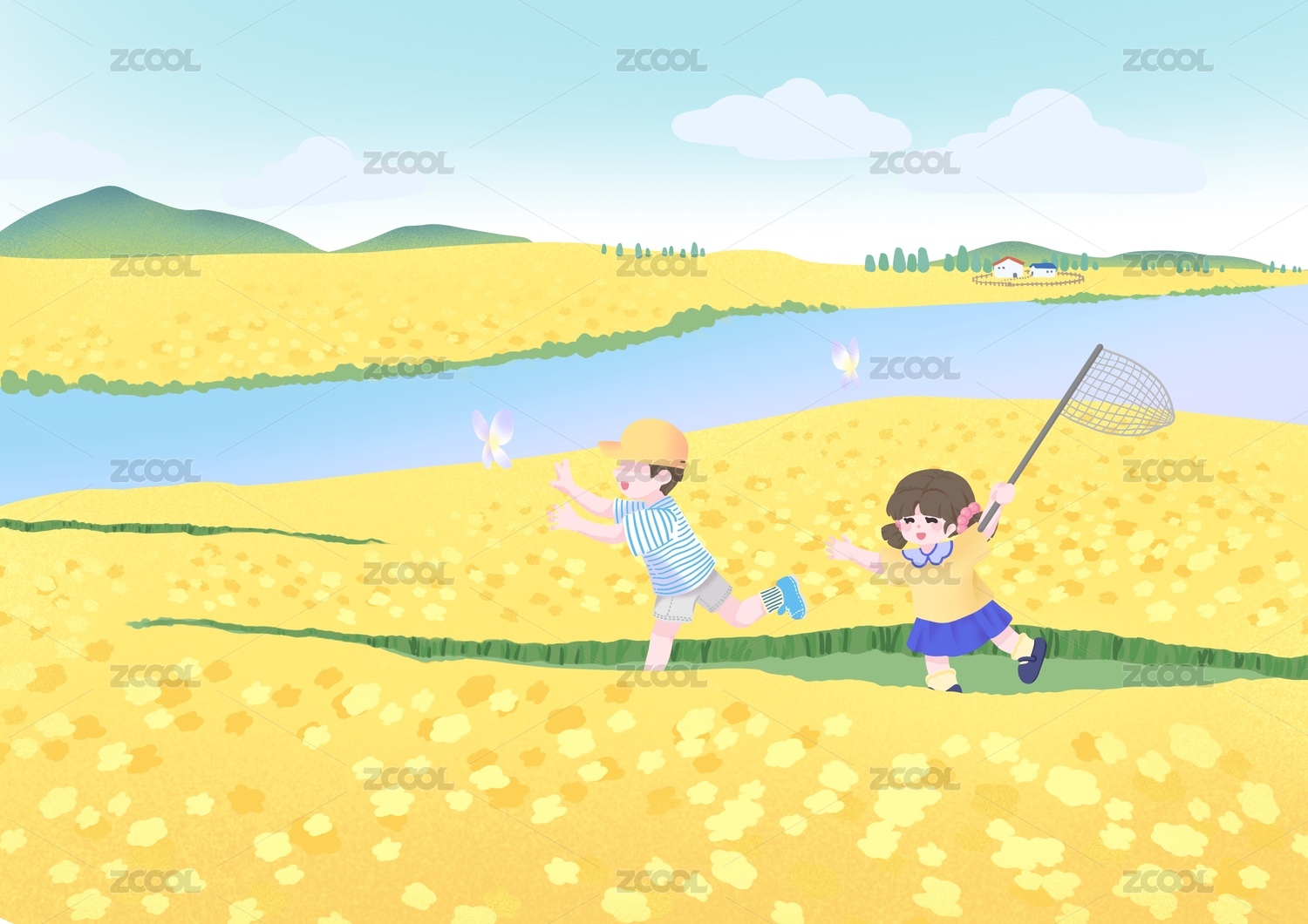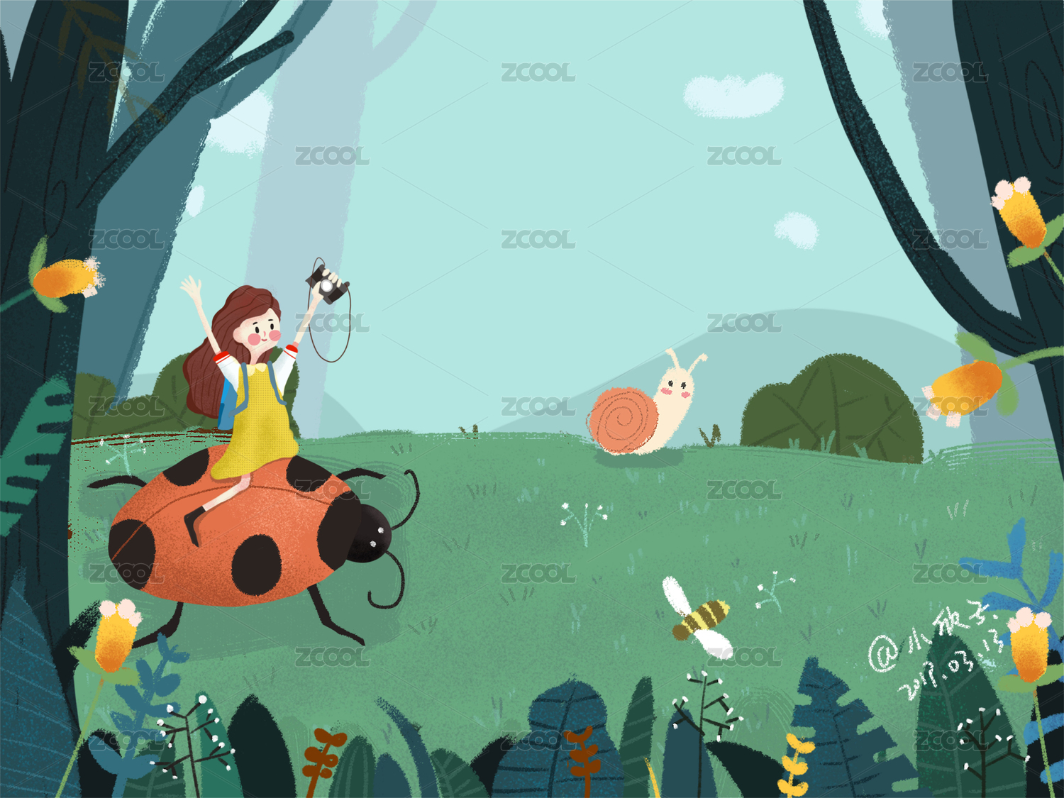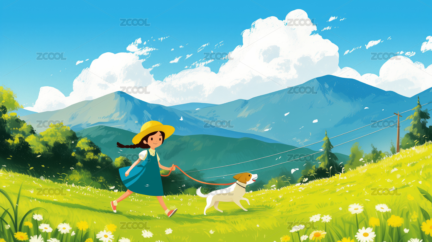 春天,植物,户外,扑蝴蝶,狗,女孩,花,草,树,肌理插画