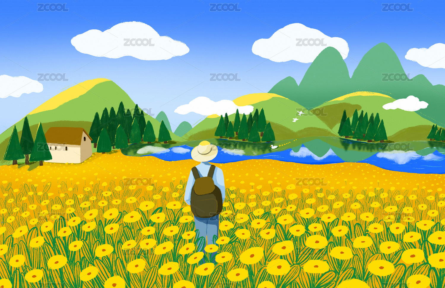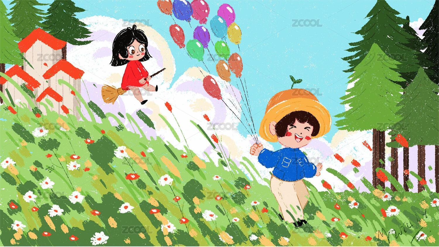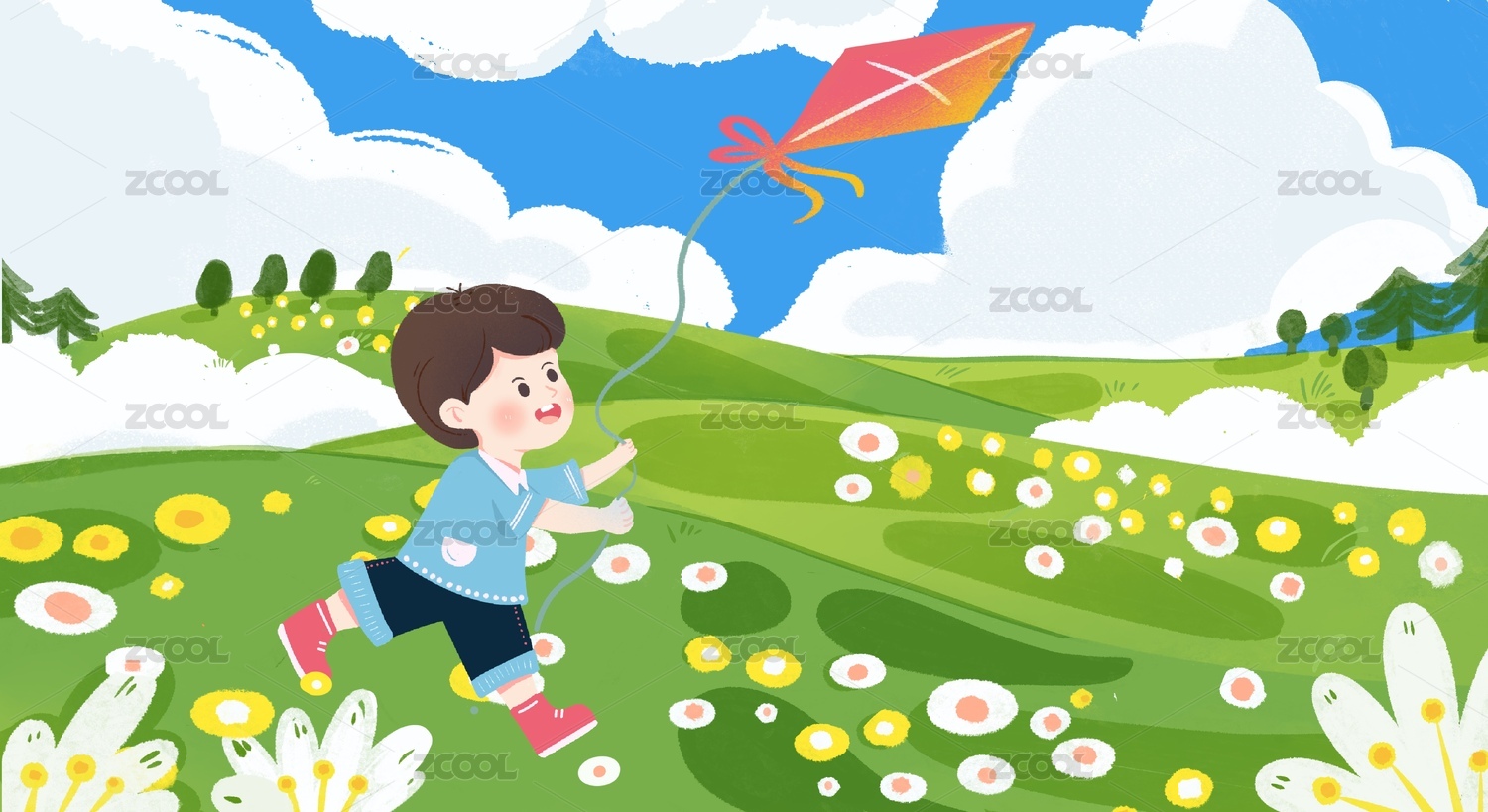 春天,植物,户外,扑蝴蝶,狗,女孩,花,草,树,肌理插画