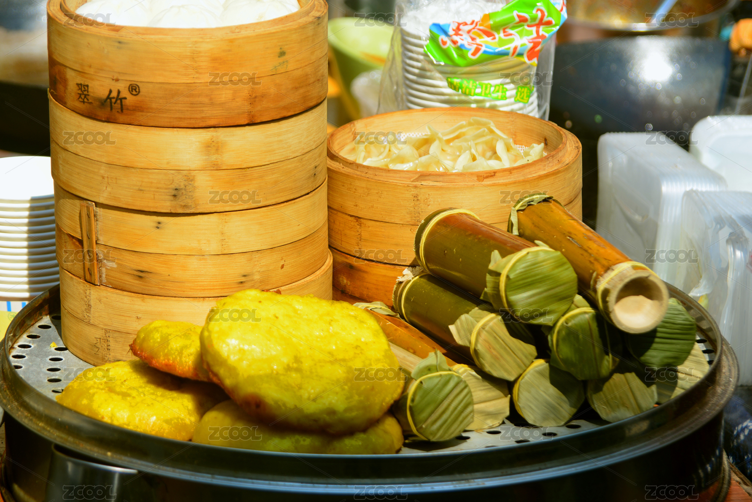 早餐蒸笼里各式各样的馒头