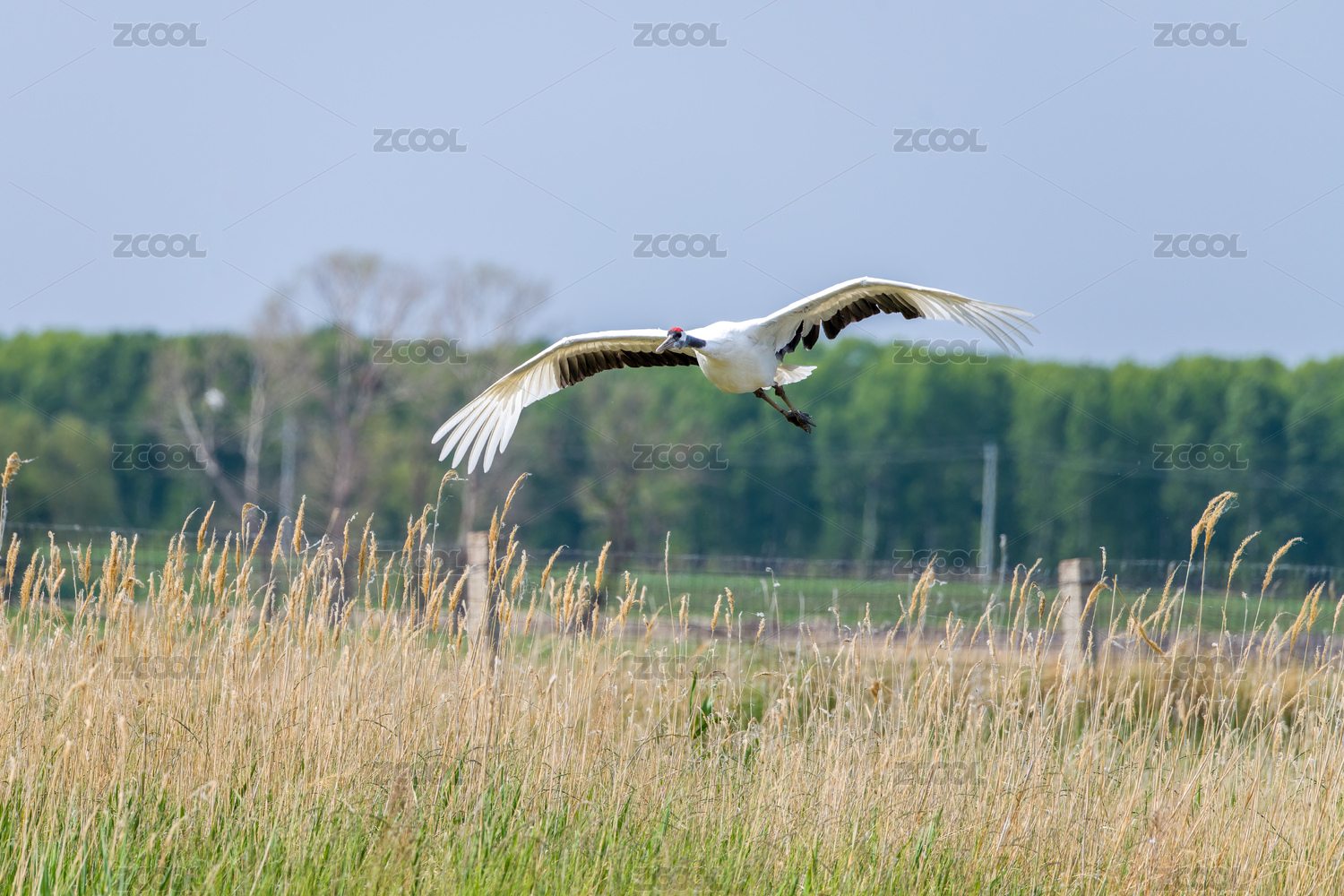 扎龙丹顶鹤自然保护区沼泽湿地里飞翔的丹顶