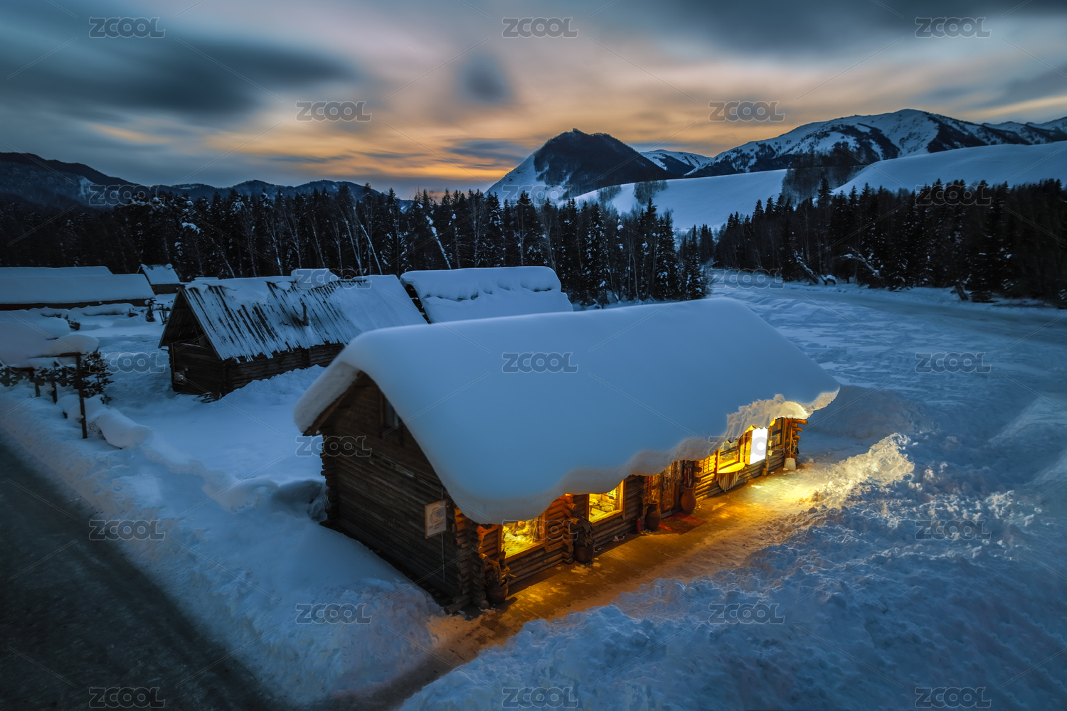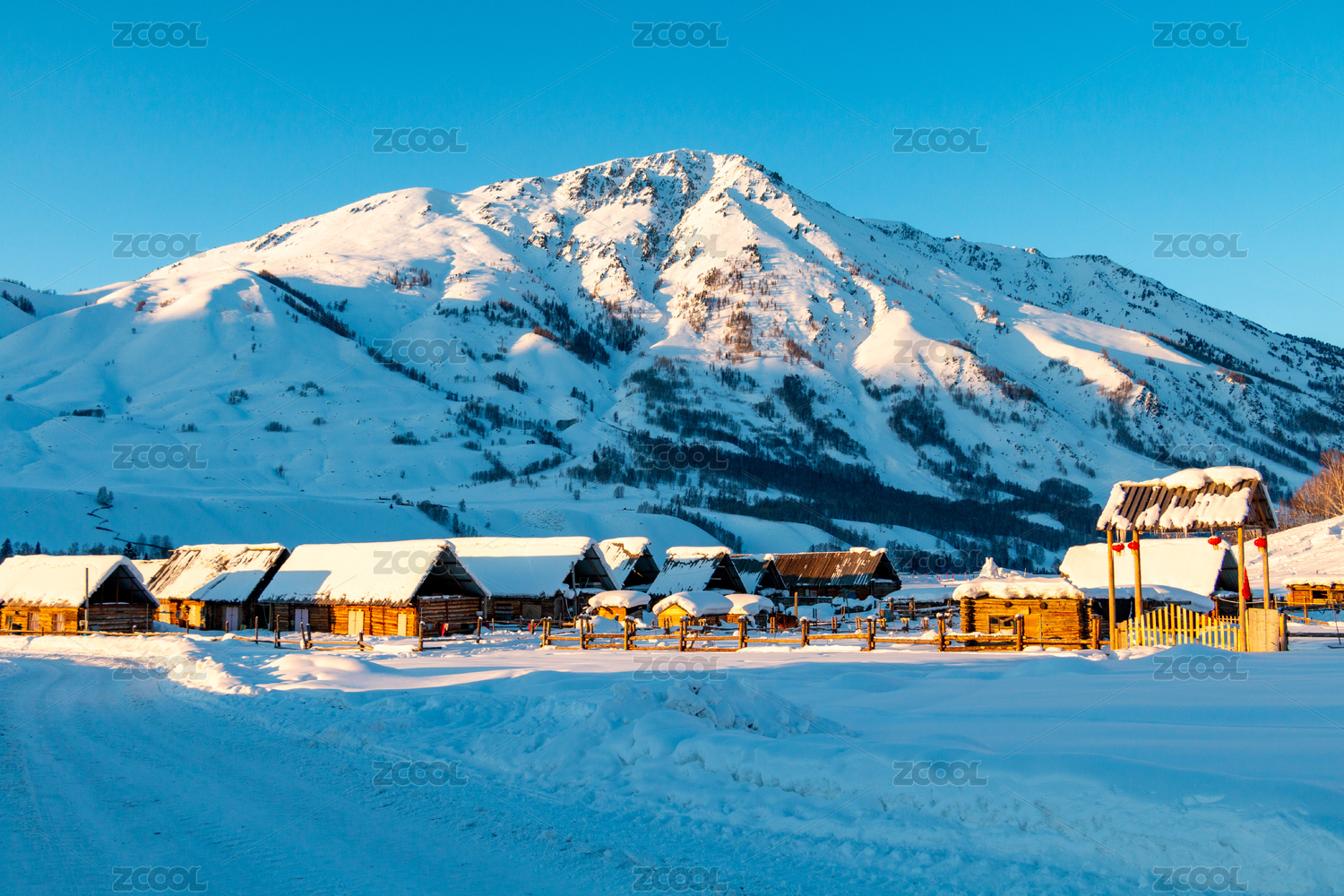 中国新疆禾木的村庄和雪山和晚霞美景
