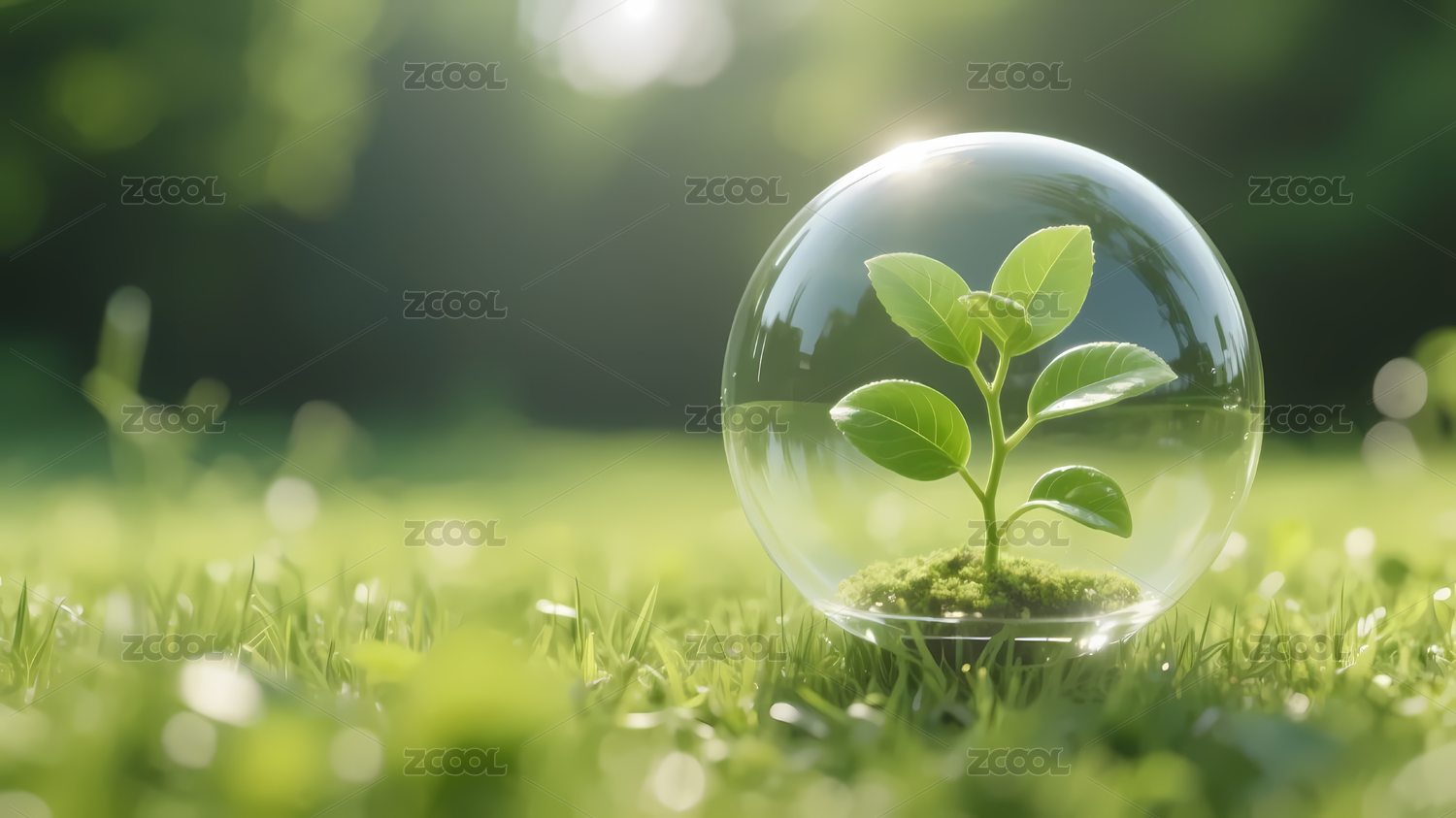 绿色草地上一个带有小树苗的透明玻璃球