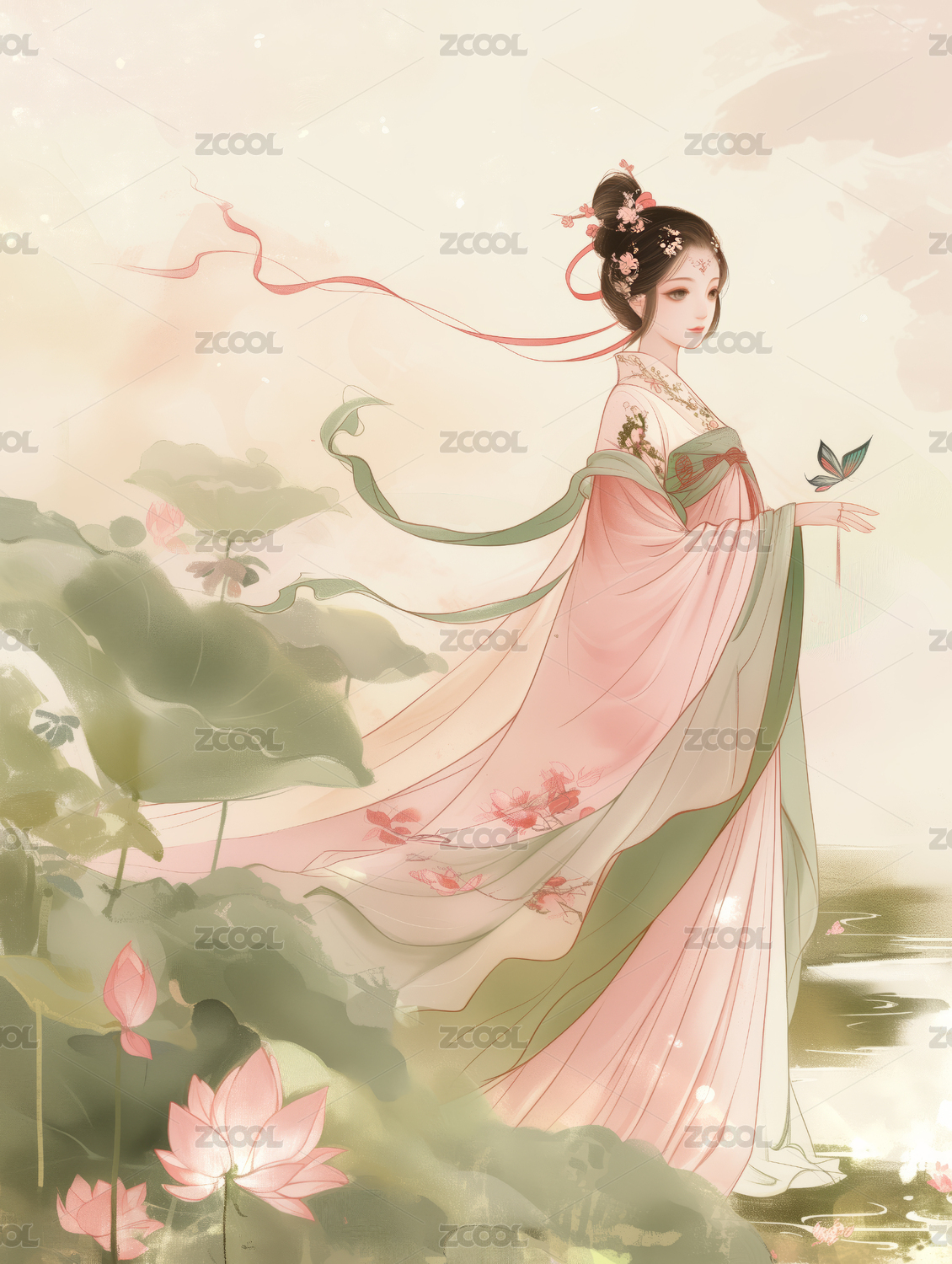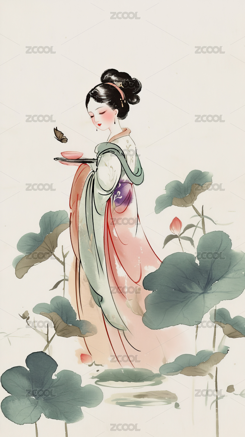扁平风格的中国风荷花荷叶和少女工笔绘画