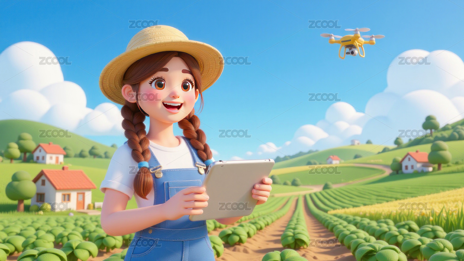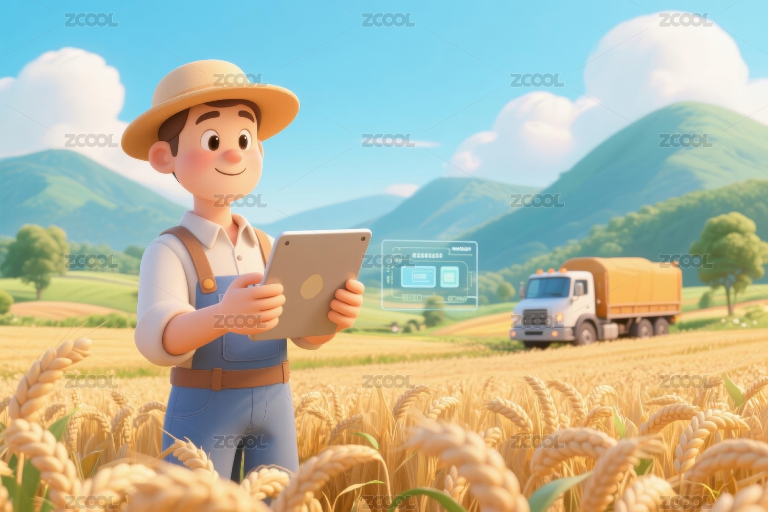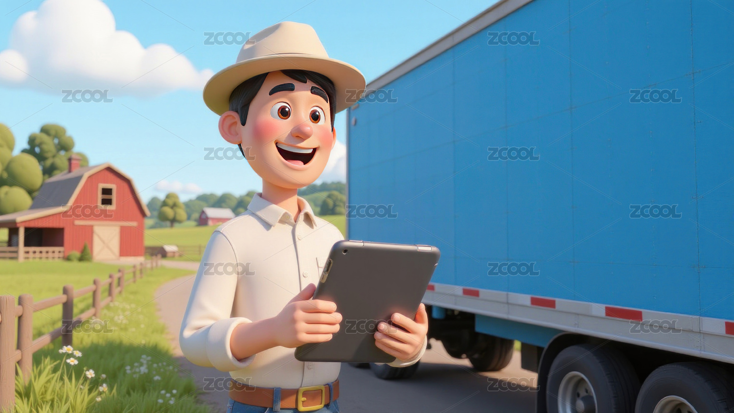 戴帽子的年轻人在农场货车旁使用平板电脑