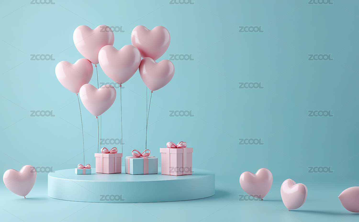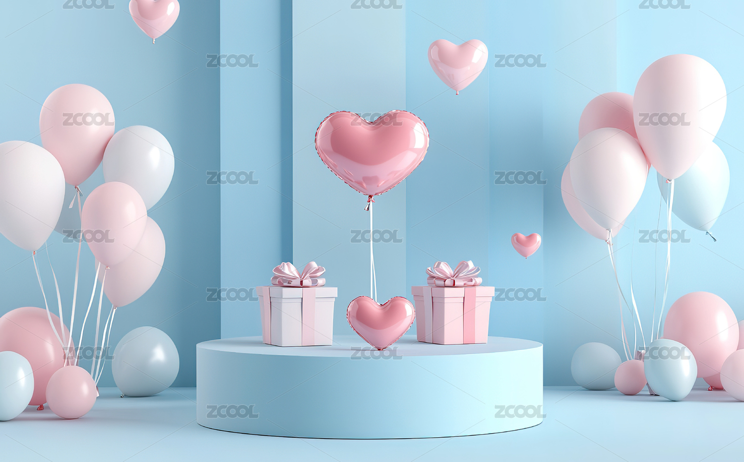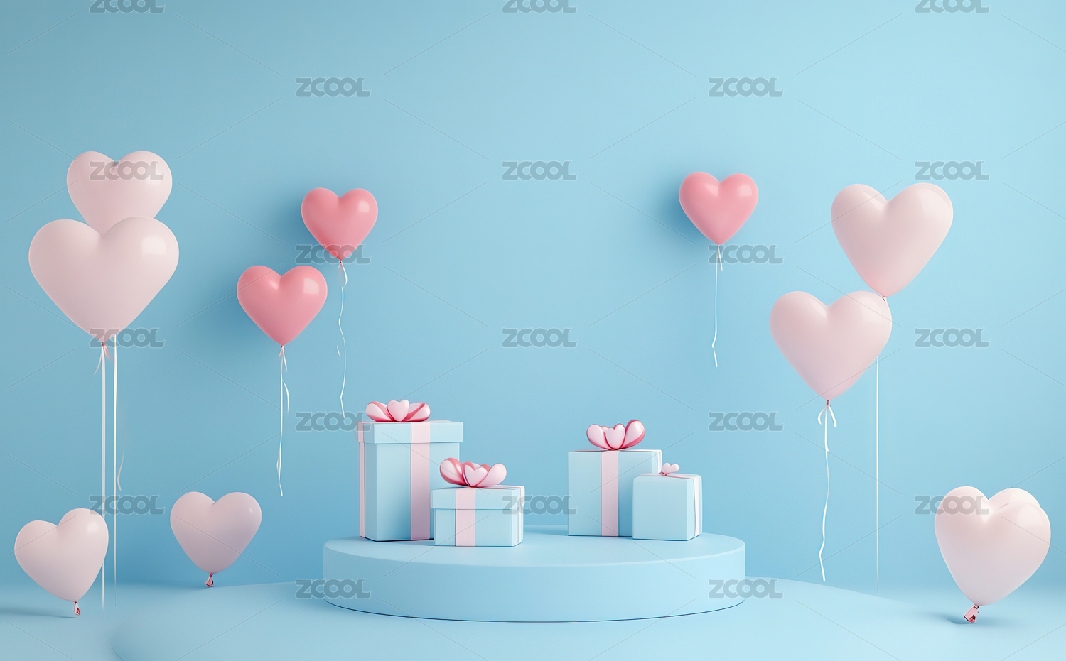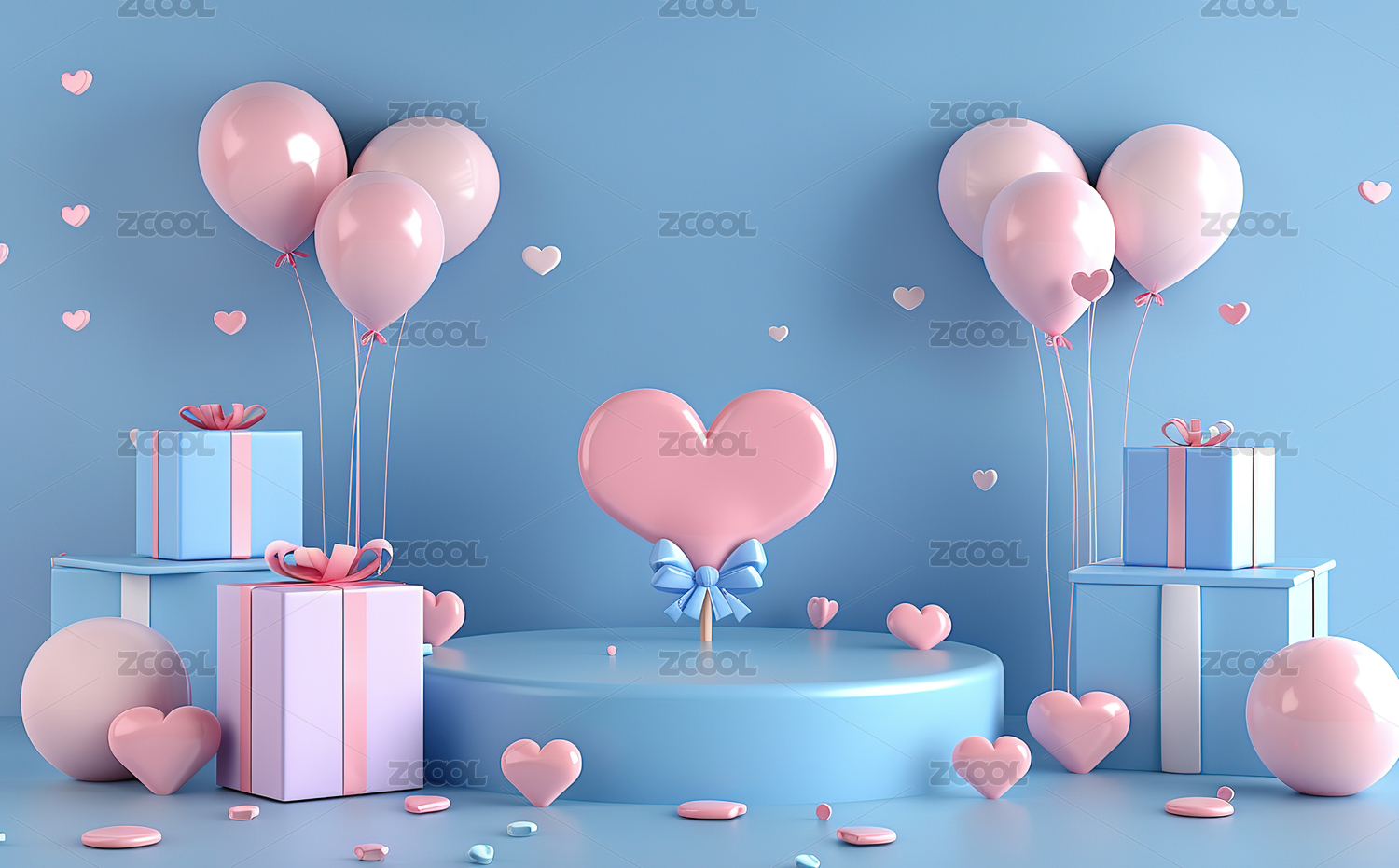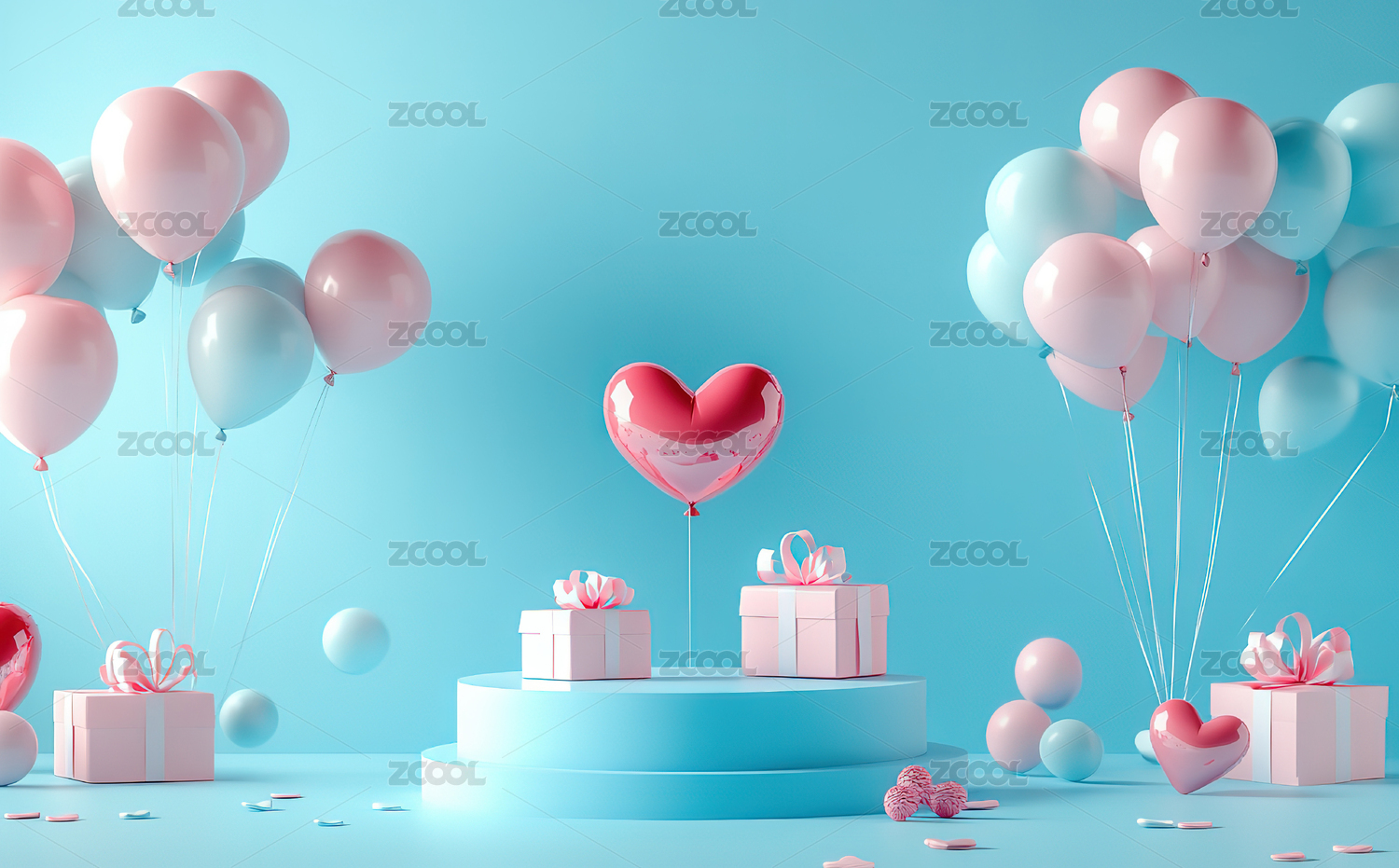 粉蓝心形气球与礼品盒