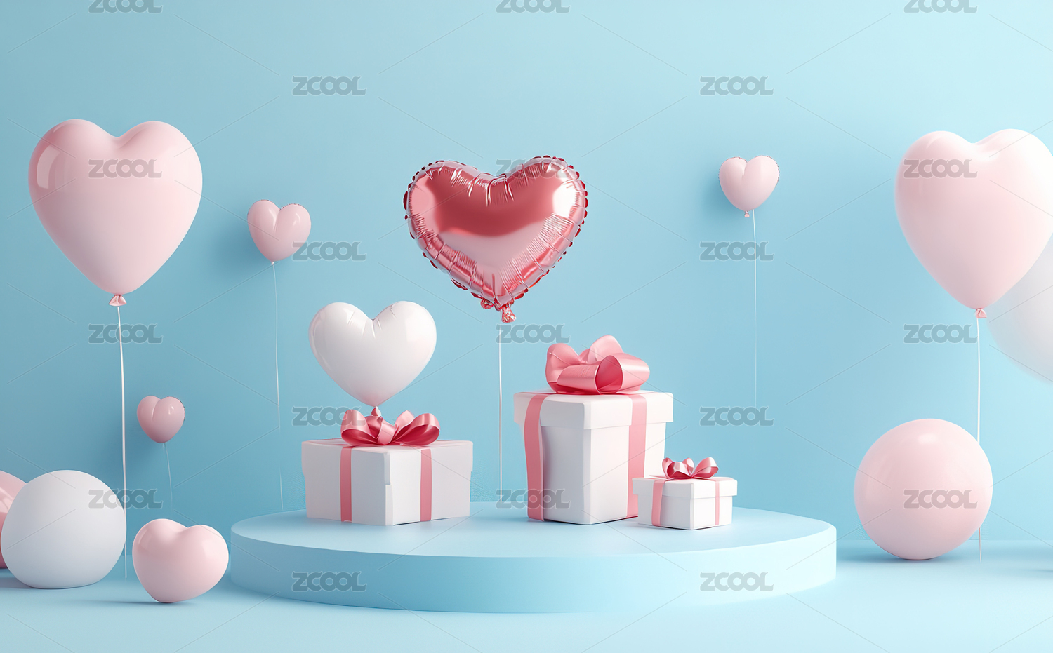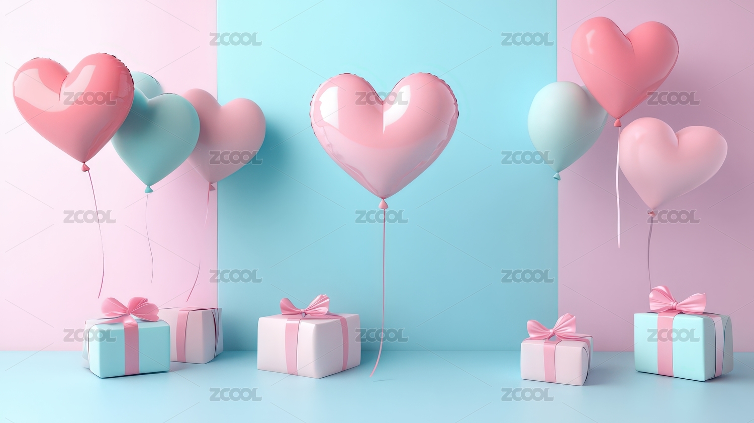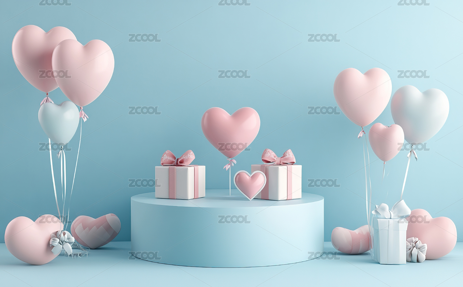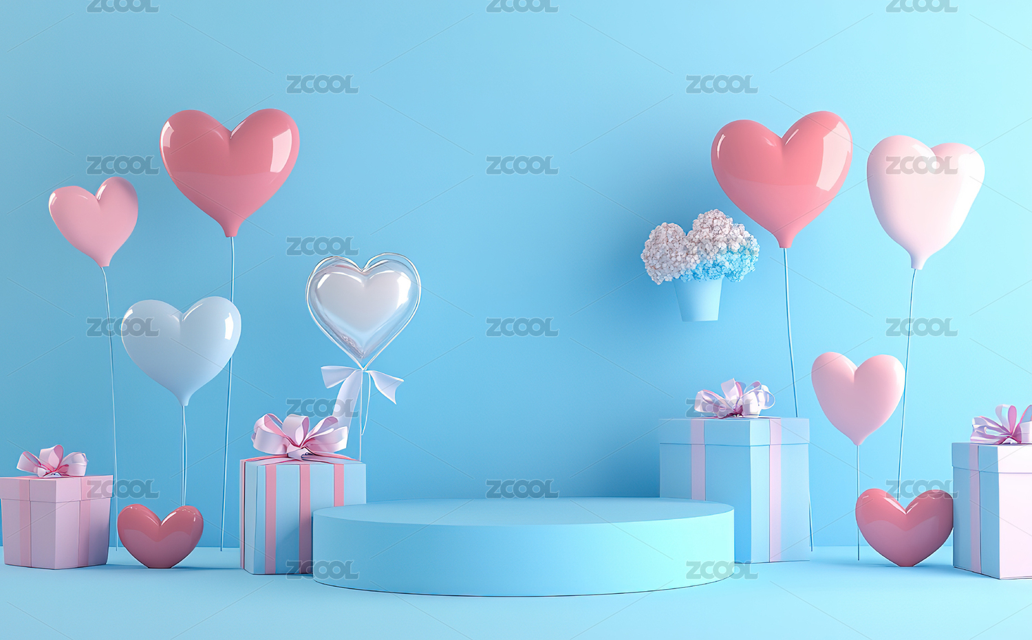 粉蓝心形气球与礼品盒