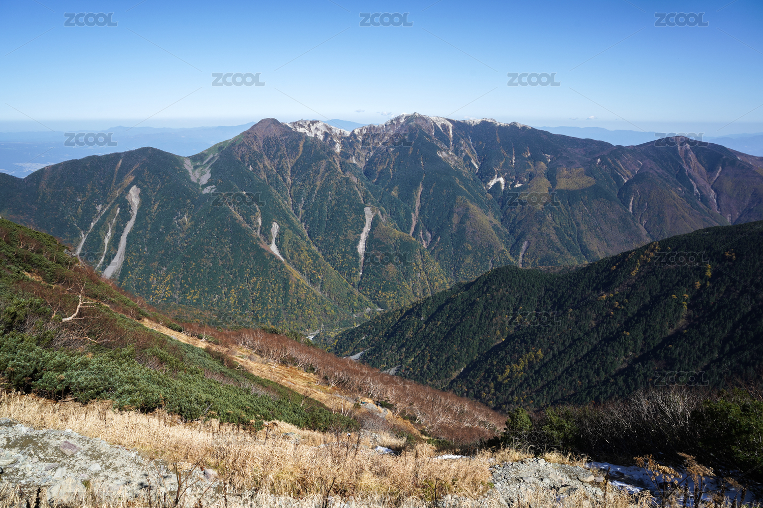 北岳的登山路线和远处的甲斐驹岳 日本南阿尔卑斯山脉