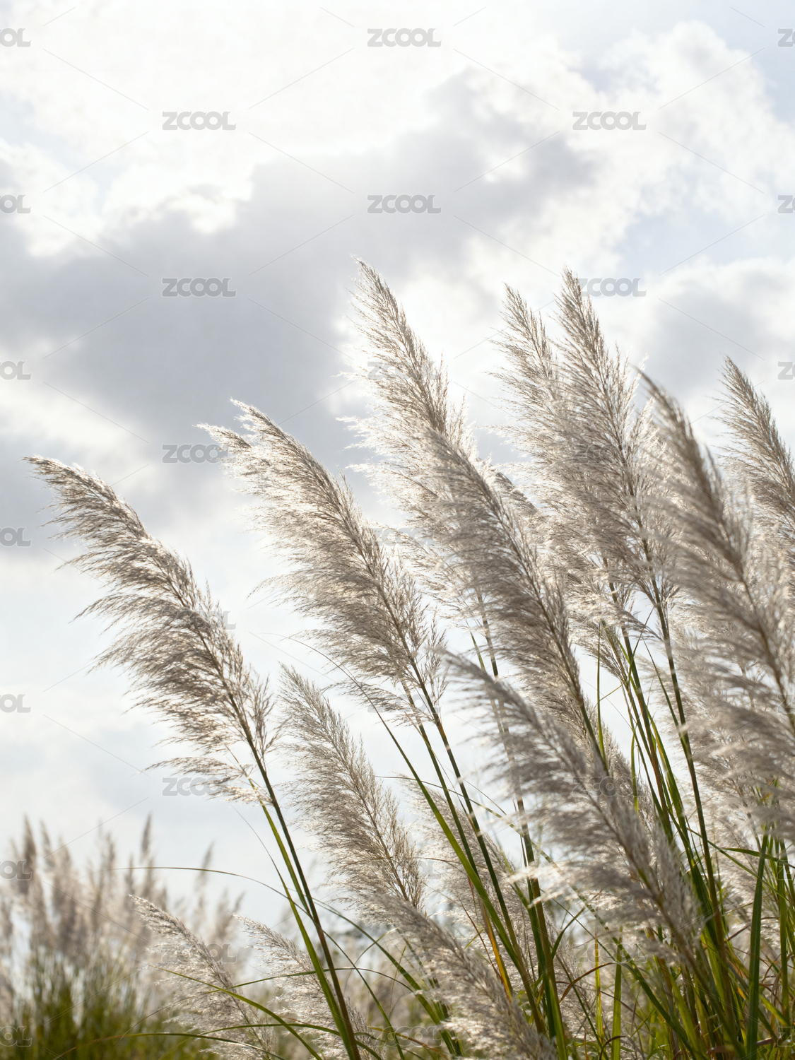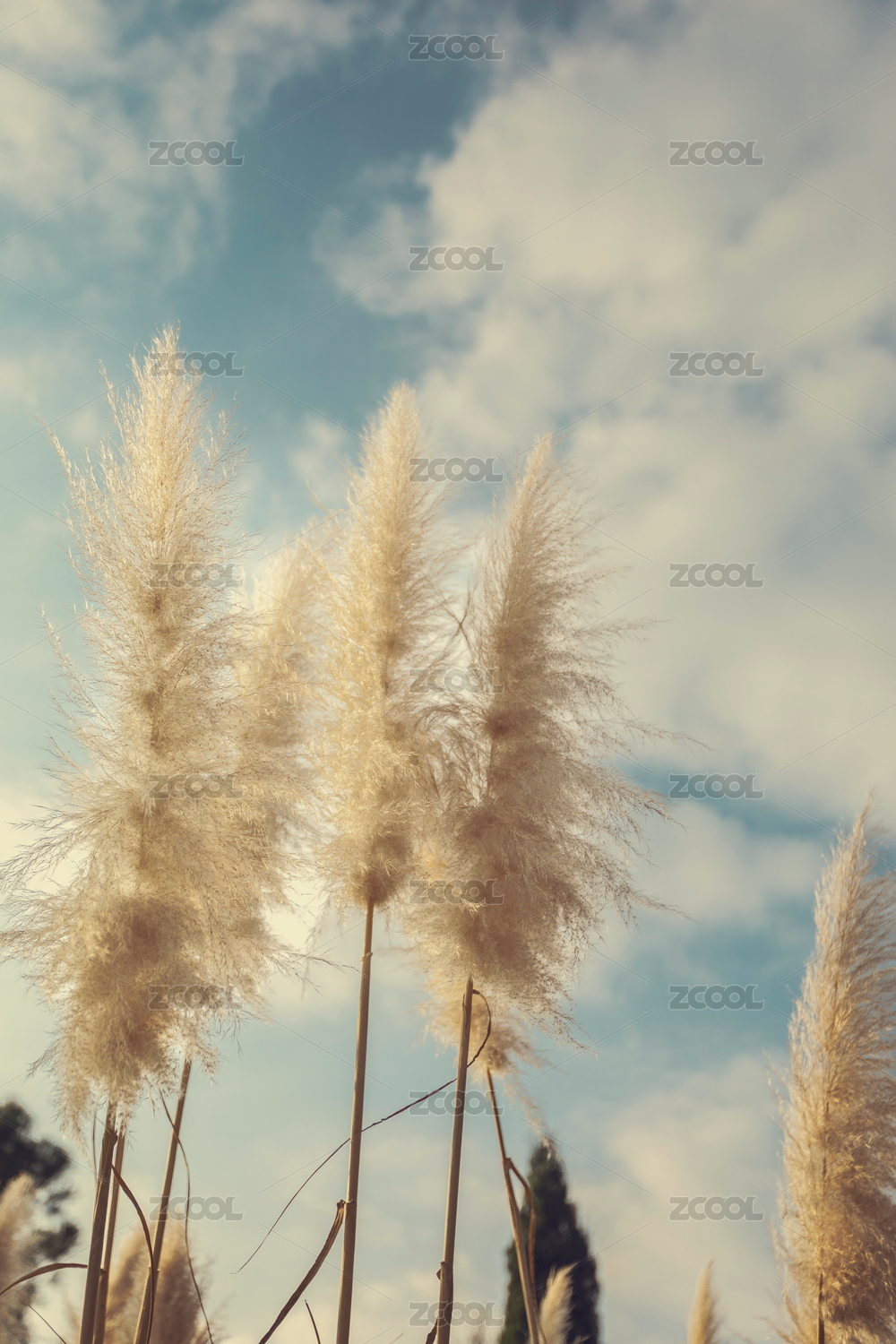 中国云南昆明滇池坝河湿地蓝天白云芦苇花