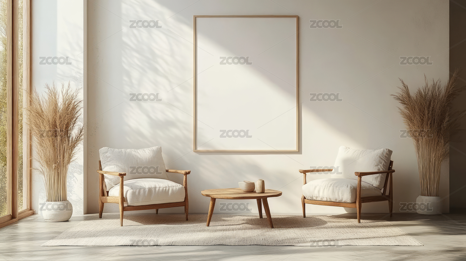 白色室内空墙面与混凝土地板有扶手椅与日光